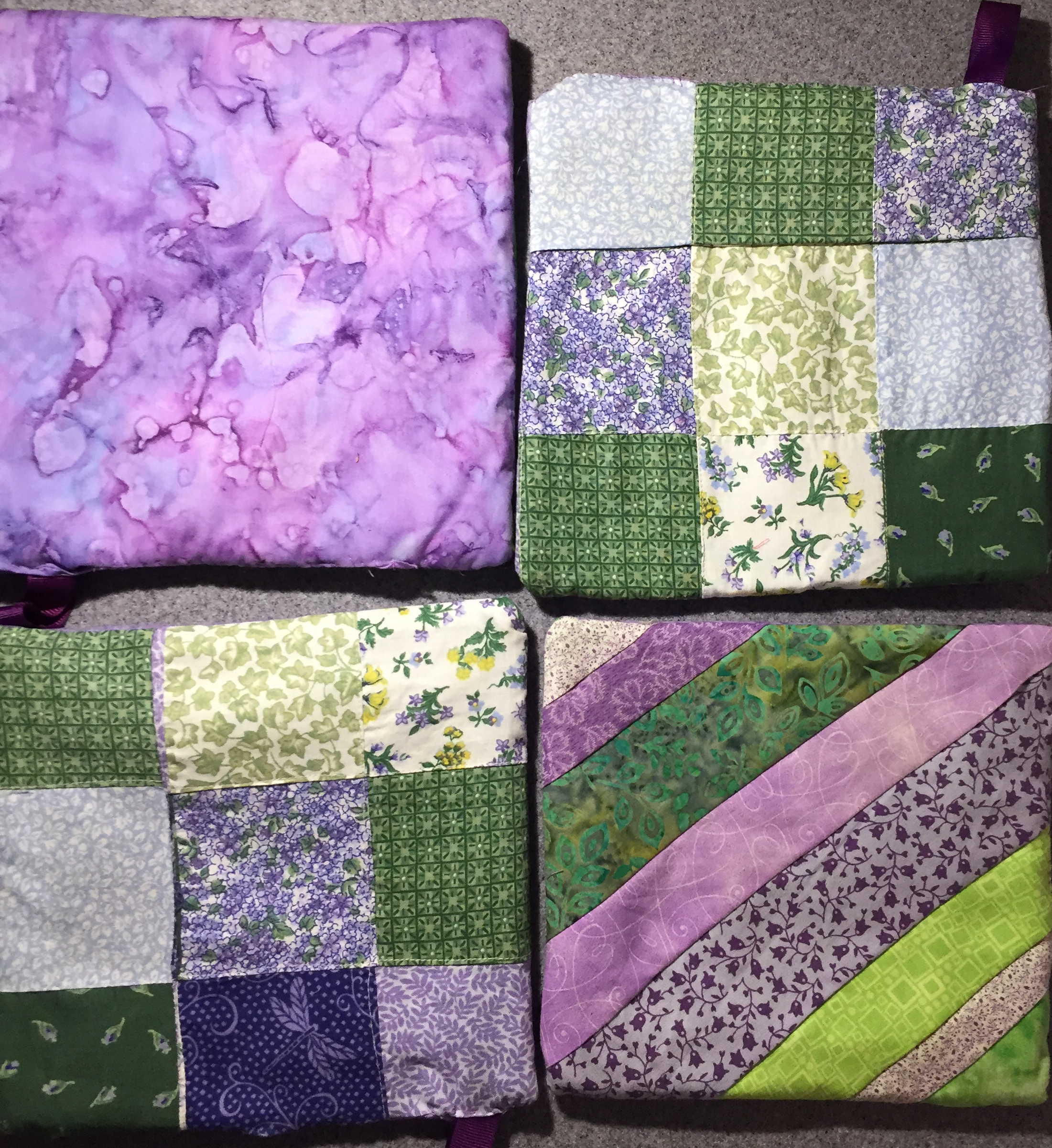 A present my sister Ellen made for Barbara and me: These four beautiful handcrafted quilted pot-holders in purple and green, to match the colors of the walls of our kitchen: