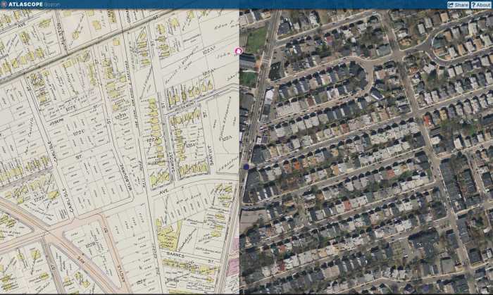 Yesterday I attended a fascinating workshop at the Boston Public Library (JP branch), where we explored their new home-brewed web-based software for dynamically viewing historical changes in local maps and used it to trace some local JP history, such as the path of Stony Brook above and below ground. Give it a try! The interface is not 100% intuitive, but it’s quick to learn and you’ll get the hang of it with no trouble. As you’ll see in the screenshots below, the old map view is overlaid perfectly on a modern map, so you can compare the two. You can select from various old atlases and of course you can pan and zoom. If you don’t like the aerial photo that I have chosen, you can do a street map instead.