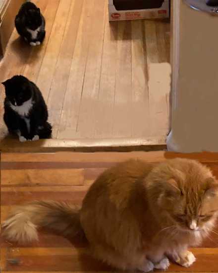 William, Flicka, and Vincent — as you can see — were observing proper social distancing as they lined up six feet apart, waiting patiently for their dinner last night. (BTW, William isn’t quite as large as the perspective makes him look, nor are the others as close as the perspective suggests. I could probably turn that into a geometry problem.)