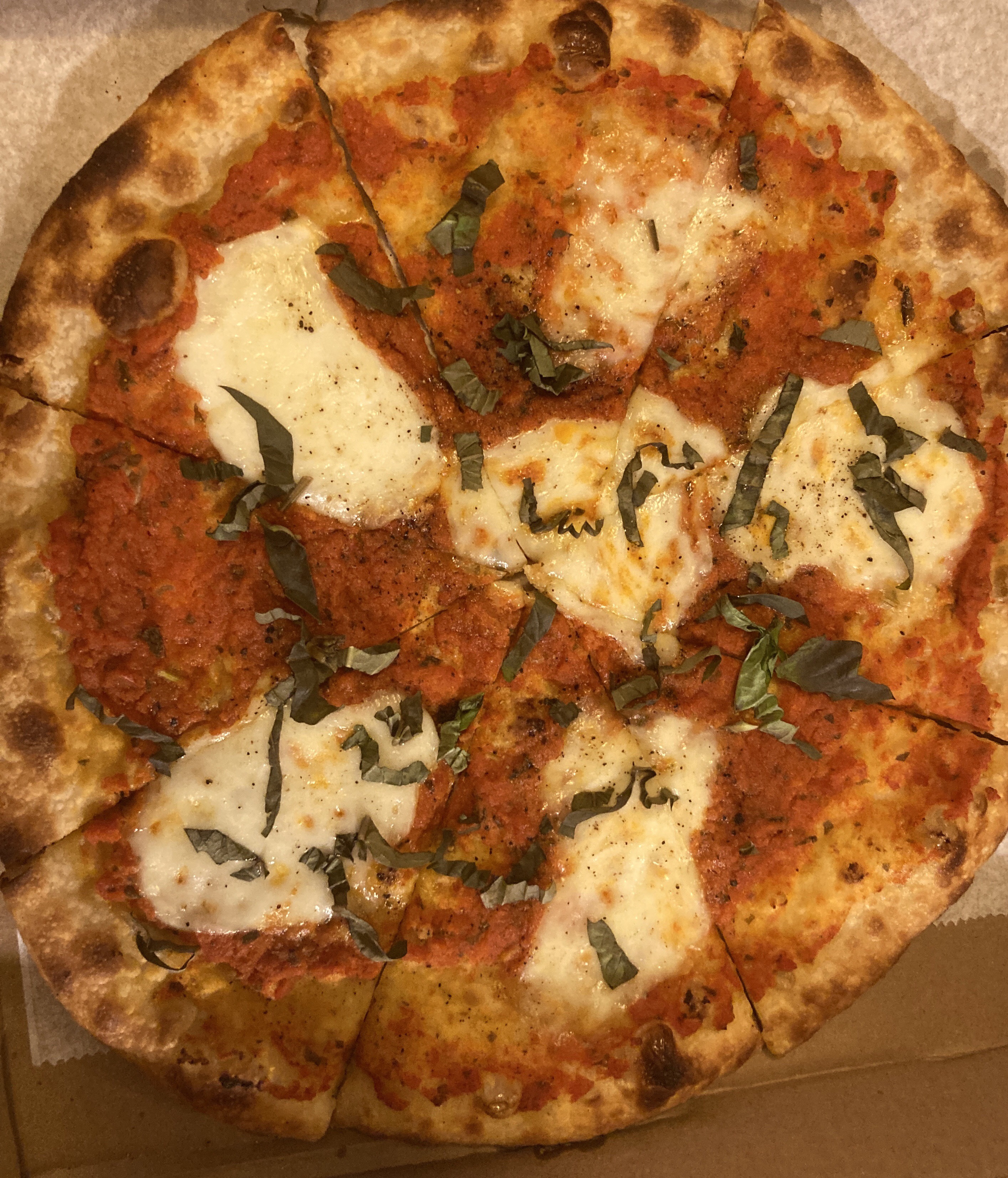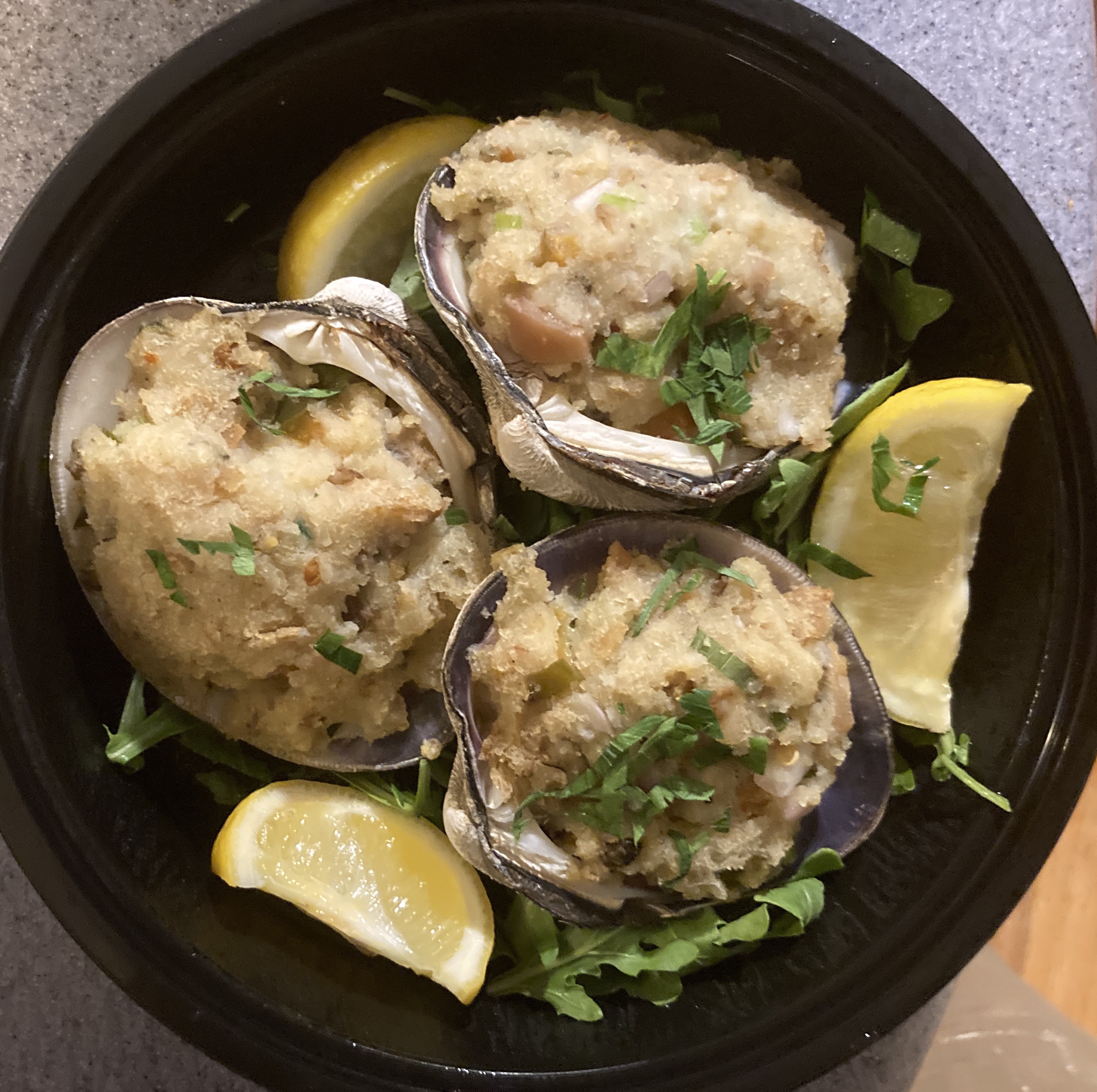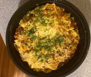 So Barbara and I got delicious takeout from Tavolo last night: stuffed quahogs, margherita pizza, tagliatelle bolognese, flourless chocolate cake — all first-rate.