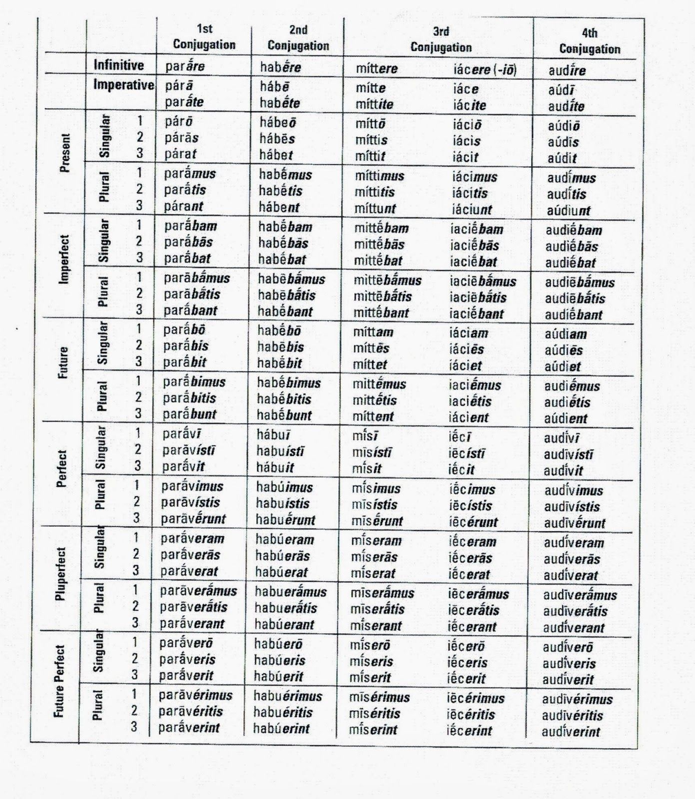 Examine the chart in the figure: officially there are four different conjugations (but really five), with lots of subtle variation, primarily in vowel choice and vowel length. How do we make sense of all this? What’s the Big Idea here?