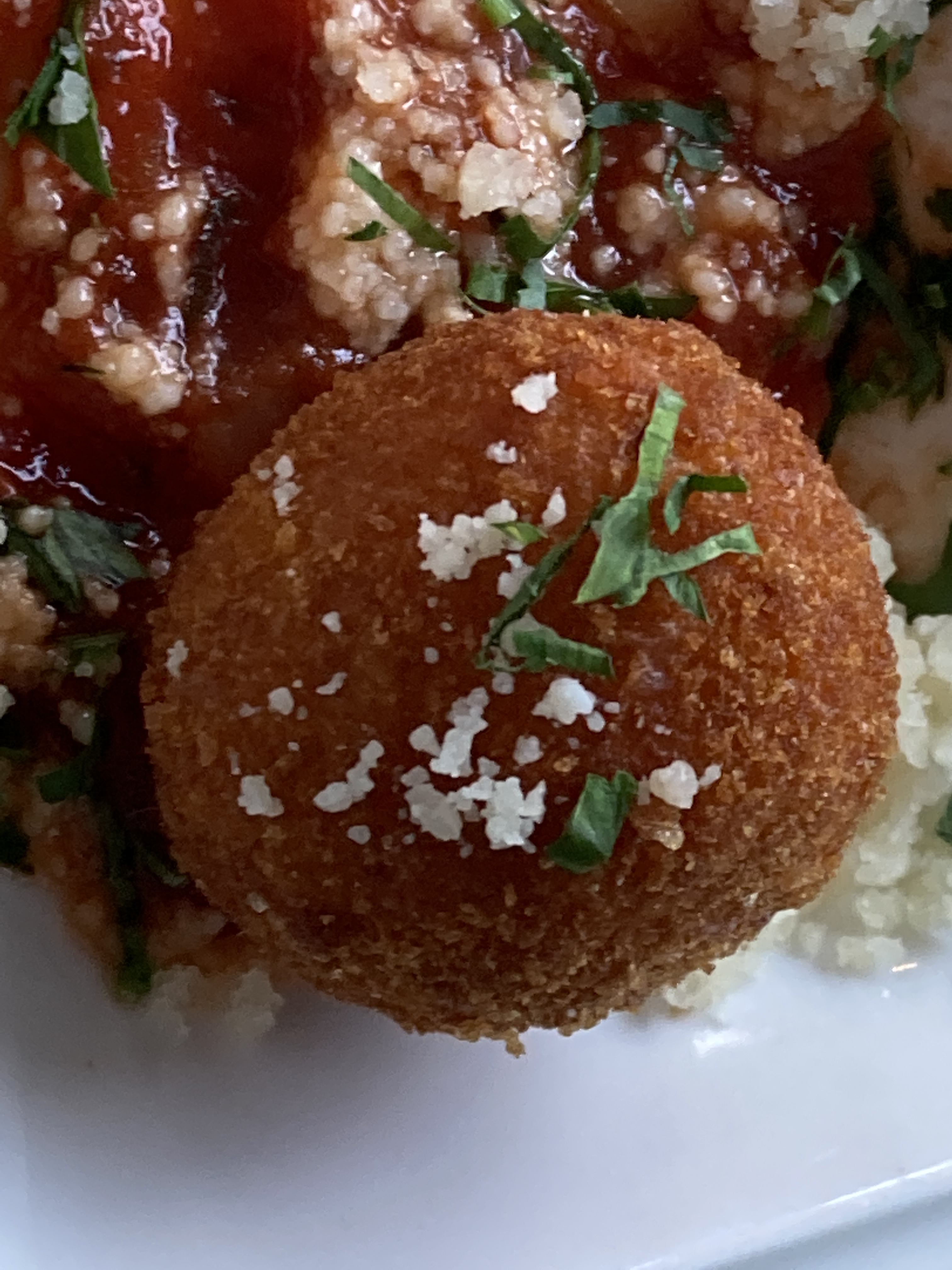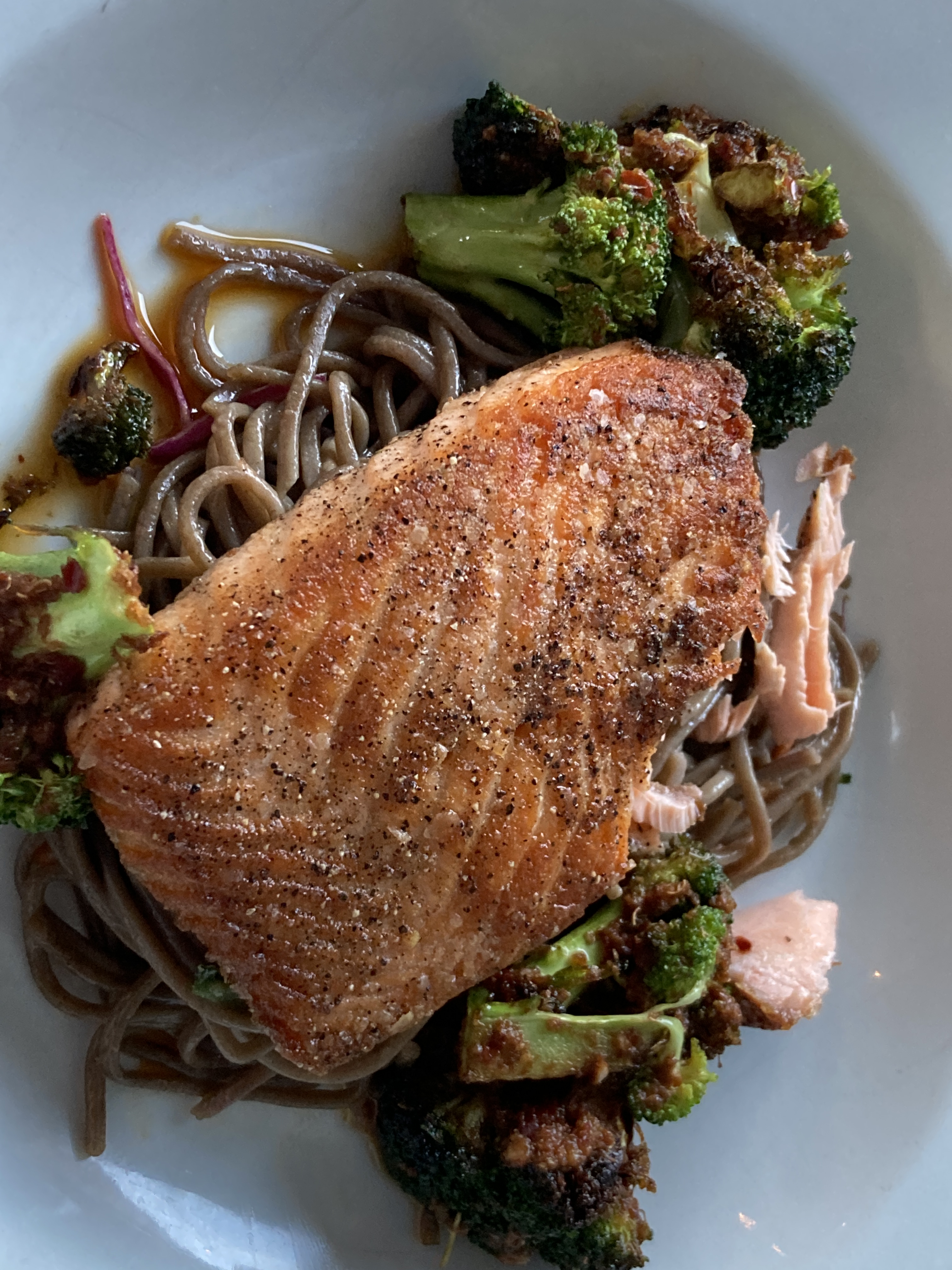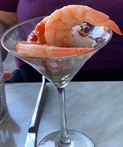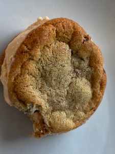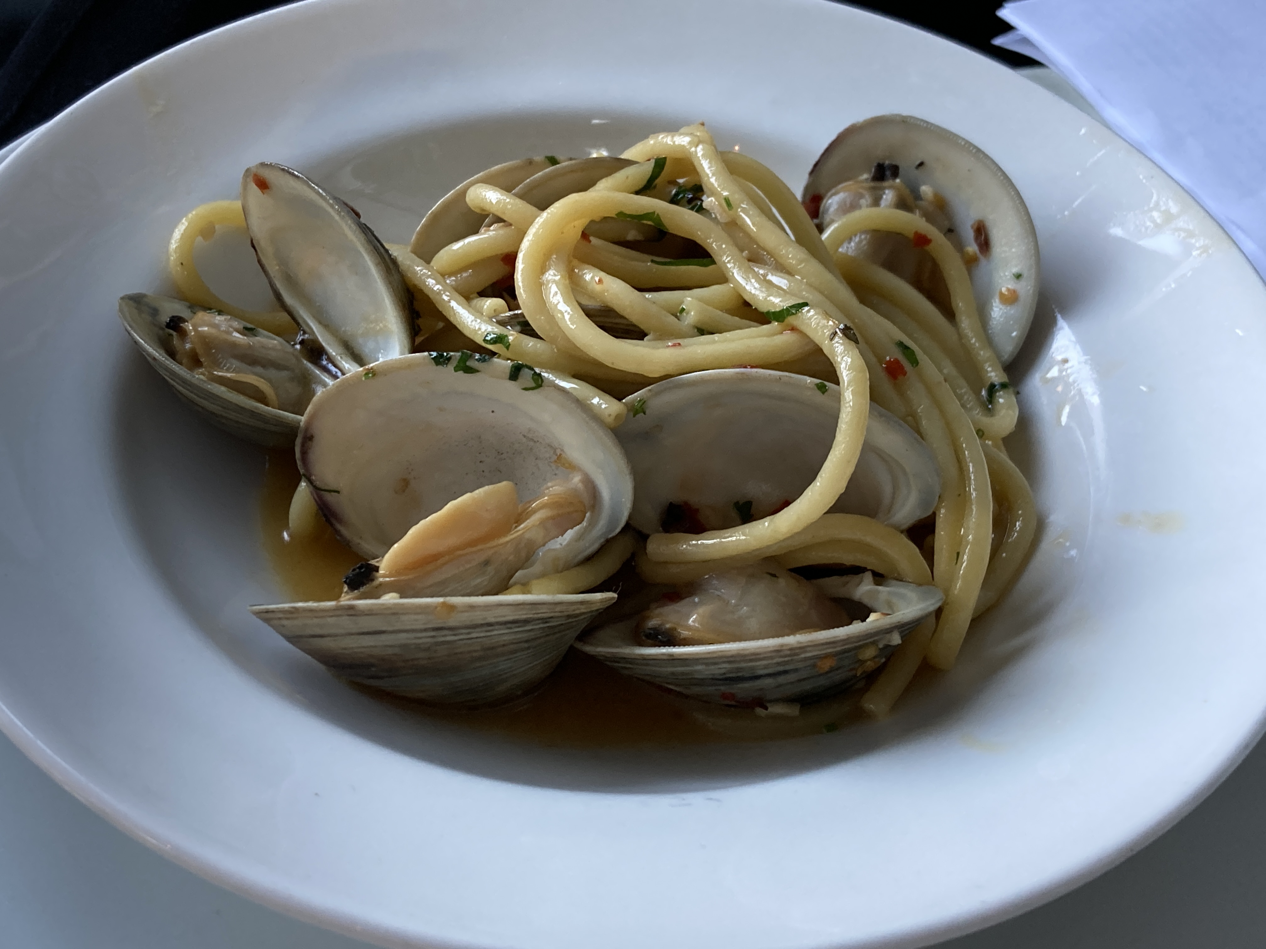All in all, it was an excellent dinner: food and service were first-rate (although some of the customers were not). Barbara had shrimp cocktail followed by bucatini with clams; I had cheesy arancini followed by salmon with soba noodles and broccoli. Chocolate-chip-cookie ice-cream sandwich (with caramel ice cream) and espresso for dessert.
