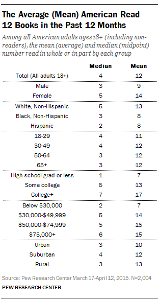 According to Pew, the average adult reads — wait! median adult or mean adult?— OK, the median adult reads 12 books per year, whereas the mean is only 4. Ponder that discrepancy for a minute!