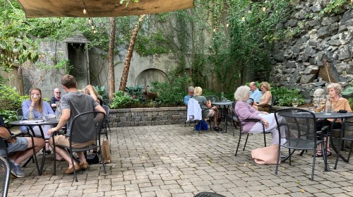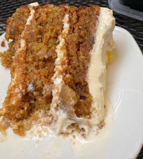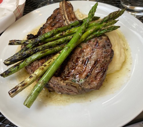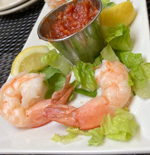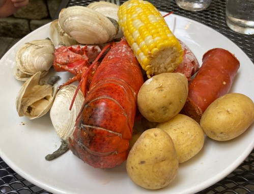 The Ashmont Grill has reopened! Barbara and I ate dinner last night on the spacious and beautiful back patio. Barbara had their special New England Lobster Dinner (steamers, lobster, chorizo, corn on the cob, potatoes), with Nanny Sheila’s renowned carrot cake for dessert (I relieved Barbara of the obligation to eat the ice cream that came with the carrot cake). I had a shrimp cocktail followed by a grilled bone-in ribeye, with grilled asparagus and mashed potatoes. Yum!