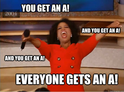 And you don’t get it for trying! You get it for demonstrating what you know and what you have done, i.e. your competence. So of course it is OK if everyone gets an A. If it just so happens that I as a teacher get a first-rate group of students, and I teach them really well, and they all do what they are supposed to do and demonstrate excellence, then they all get an A.