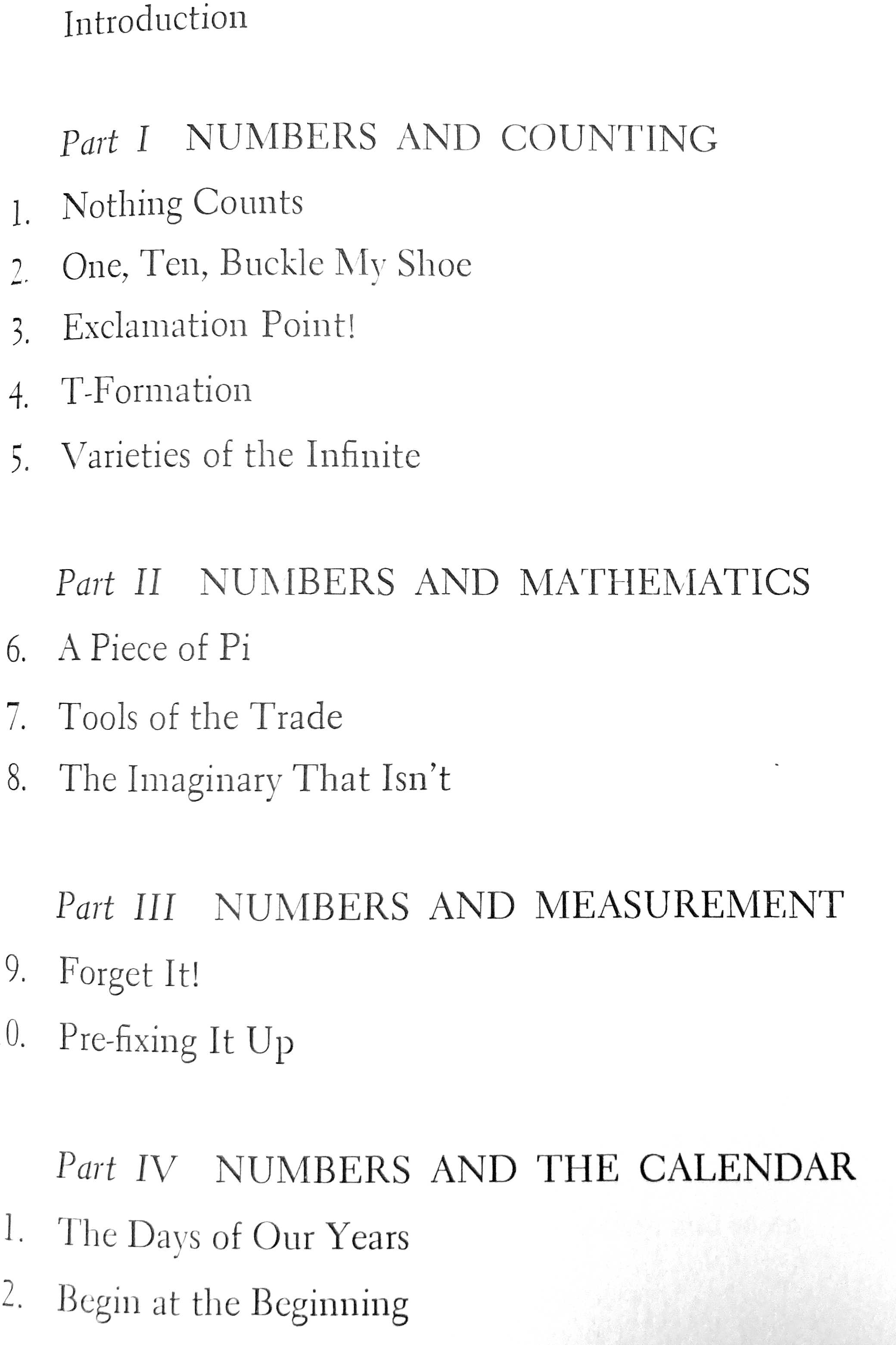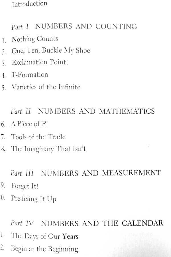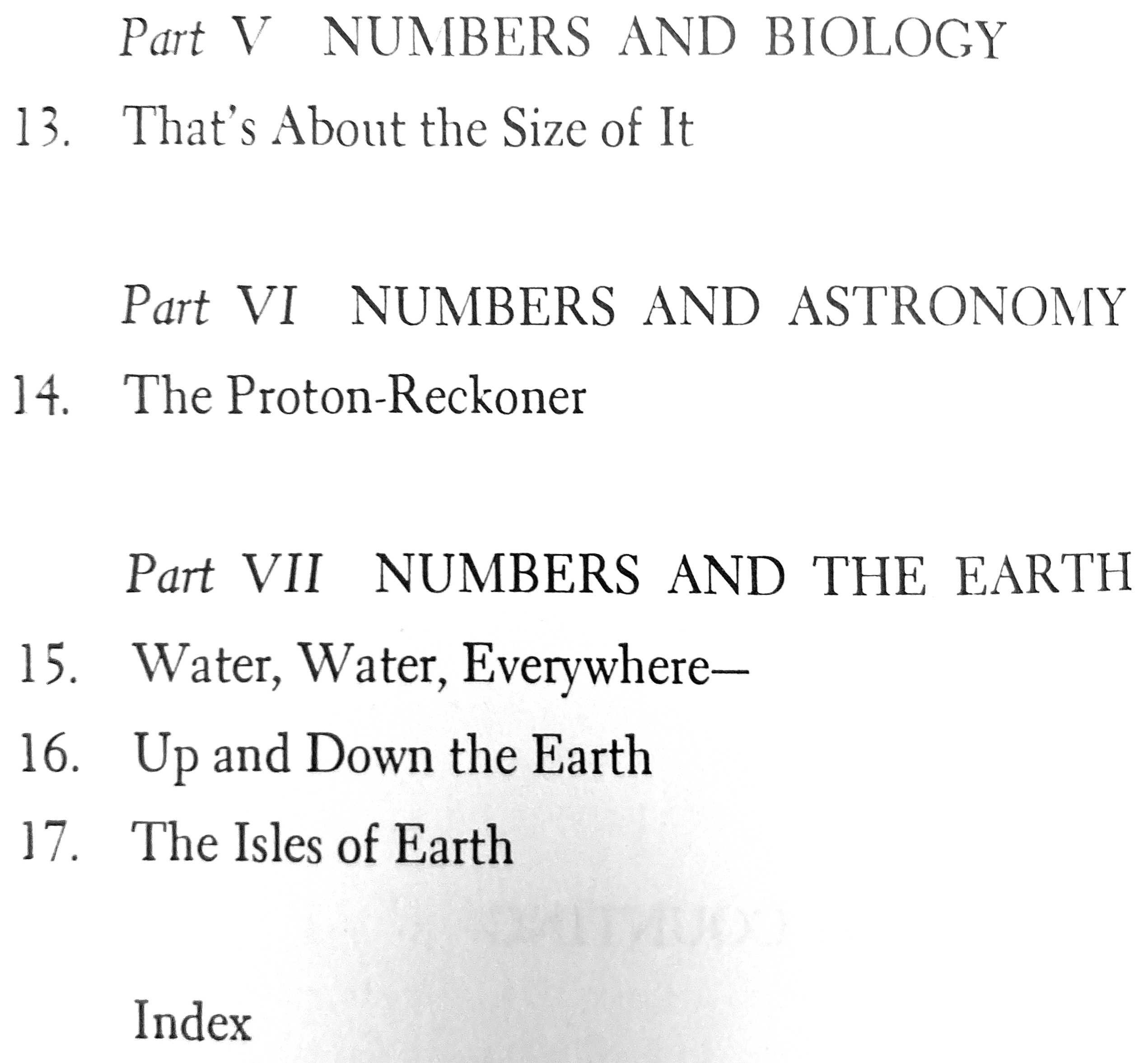 Anyway, I recently came across a reference to Asimov’s collection of essays about math, Asimov on Numbers. So I had to check out a copy from the library and read it again. Although these essays had all been initially published in The Magazine of Fantasy and Science Fiction between 1959 and 1966, they remain fresh today. A few needed updating when the collection was published in 1977 — primarily because of new discoveries for pure math or new data for applied math — but nothing very significant. The best thing is the combination of relaxed and conversational style married with mathematical accuracy. Reading the essays with a fresh eye as a math teacher with decades of experience, I was struck by the observation that Asimov’s choice of topics happens to be an excellent subset of what I might choose if I were writing such a book today! I say “subset” because some obvious candidates for missing choices include cryptography, fractals, and game theory, but none of those would have been likely chapters in the ’60s. Take a look at the Table of Contents (image below), and you’ll see what I mean. Then get your own used copy of the book, either from a library or from Amazon, and give it a whirl.