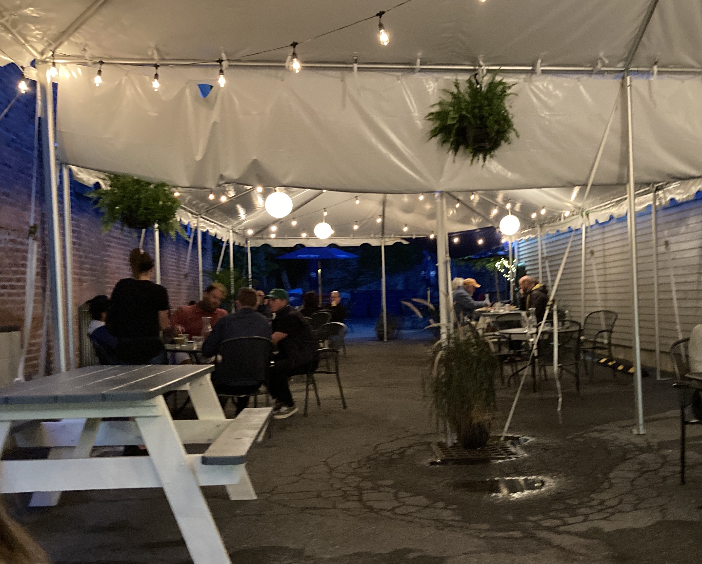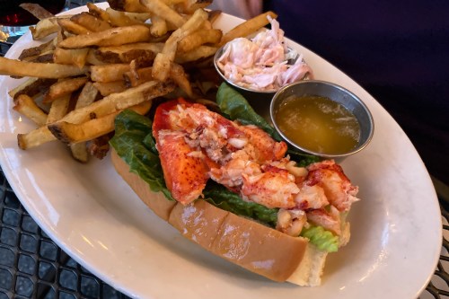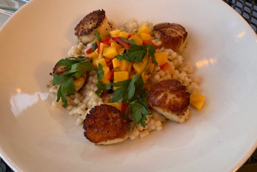 Barbara and I had a yummy dinner on the patio under the tent at Ashmont Grill last night: grilled asparagus; confit pork belly lettuce cups (which unfortunately disappeared somehow before I could take a photo); hot buttered lobster roll with coleslaw and fries; pan-seared day boat scallops with Israeli couscous, mango salsa, and chili oil. Yum! (Or did I say that already?)