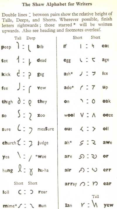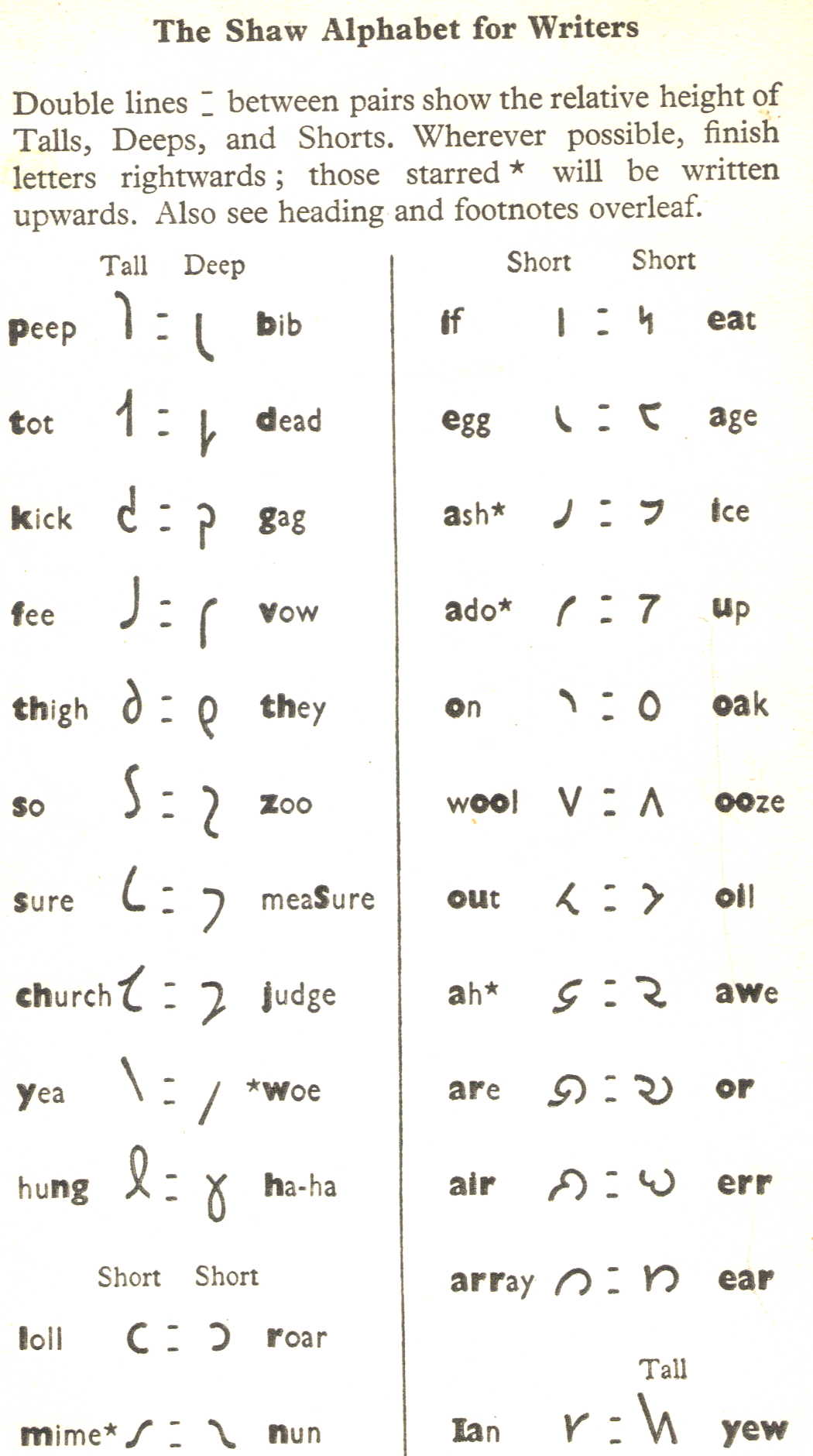 There have been many different arguments against proposals for reforming English spelling, some better than others. But none of these proposals will work. That makes me sad, as I had long ago become committed to learning and using one such reform; it was when I was 15 that George Bernard Shaw’s phonetic alphabet for English appeared in a complete edition of his short play Androcles and the Lion, with facing pages in standard and Shavian spellings and with a card (reproduced here) giving the entire alphabet in a well-organized form (unlike A–Z). Sounds are illustrated as bold letters in sample words, such as “th as in thigh“ or “th as in they.” You notice right away that this alphabet uses somewhat… unfamiliar, shall we say?… forms for the letters, as well as being phonetic. See the bottom of this post for an image of the cover, which shows the alphabet when used in a sample of running text.