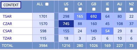 Those results are striking. (At least they struck me, though it didn’t hurt.) Altogether, and unsurprisingly, the first two are overwhelmingly the most common, and they’re pretty close. But it’s the national differences that are surprising. As you see from examining the table, czar is by far the winner in the US as well as Australia and New Zealand, but tsar is by far the winner in Great Britain and Canada. Ireland splits its votes pretty evenly, but with csar of all things tied for first! Nobody seems to like tzar.