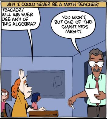 The big picture for both contexts is that nobody knows when anyone is going to use any particular piece of knowledge. On any given Sunday, anything can happen. Maybe you’ll use algebra, maybe you won’t. I don’t know. More importantly, you don’t know. Will you use algebra at some point in the future? Maybe so, maybe not. More subtly (and admittedly more abstractly) you will surely use the underlying concepts of analysis and problem-solving, even though you might not ever “solve for x.” And the so-called “smart kids” (a phrase that no good teacher would use, especially to one who is being labeled “not smart”) might be more likely to use algebra — if you buy into the implicit premise that good students go into the sciences, whereas bad students go into the arts or more likely nothing academic at all. So the teacher is being obnoxious in two ways: using the “smart kids” label and buying into the “two cultures” divide that CP Snow wrote about so effectively.