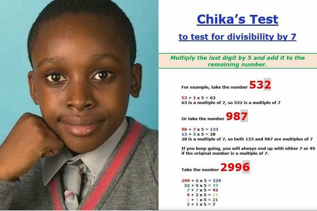 Well, like all stereotypes, there’s a certain amount of statistical reality that supports this impression and obscures all examples to the contrary, no matter how many of them there are. Sometimes these “exceptions” tend to make news. In this case we have a 12-year-old, who may be either Nigerian or English—hard to tell from the news accounts—but who in any case discovered and proved a “new” quick test for divisibility by 7. The test definitely works, the proof is ingenious, and it’s a cool, feel-good story.