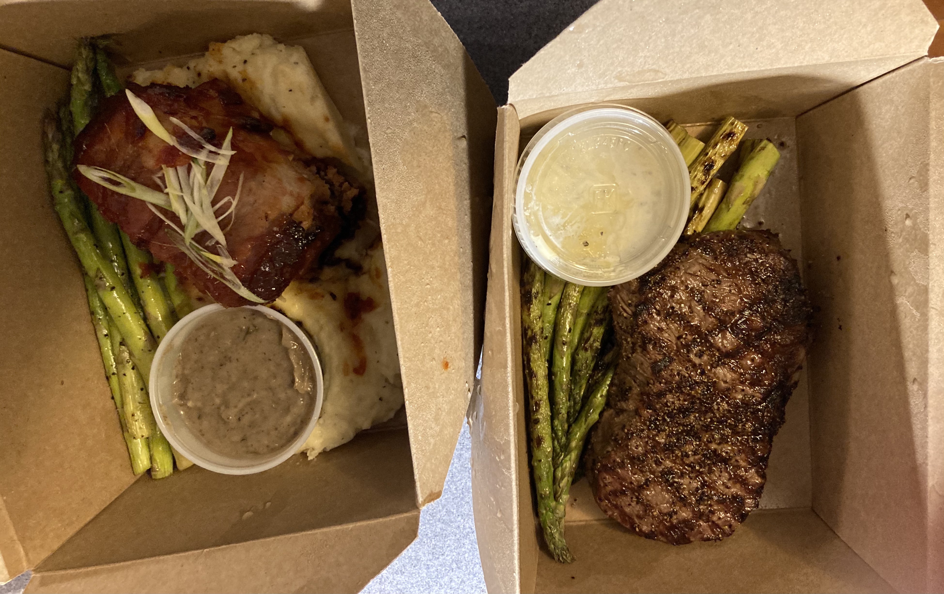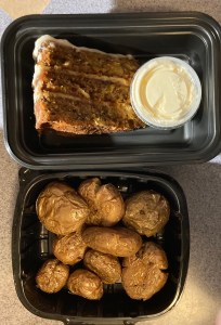 Barbara and I continue to follow Tara and Michaela’s advice: support your local restaurants! Last night we had fantastic take-out from the Ashmont Grill: bacon-wrapped meatloaf with mashed potatoes, grilled asparagus, and mushroom gravy; wood-grilled 12 oz. ribeye steak with roasted red bliss potatoes, grilled asparagus, and rosemary-garlic butter; Nanny Sheila’s carrot cake à la mode. Plenty of leftovers too! Truly delicious as always.