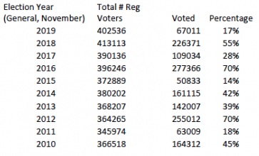 If you prefer visual representations, you might find the graphic shown above these numbers in the original article easier to grok, though there’s a reason I’m not doing that at the moment. In either case, what’s striking is the abysmal numbers in 2011, 2015, 2017, and 2019. Listed here, it immediately jumps out at you that these are odd numbers. And why do we have city elections in odd-numbered years? Read Walczak’s article to find out. For now, just consider how much better we would surely be doing if Boston elections were moved to even-numbered years, like state and Federal elections.