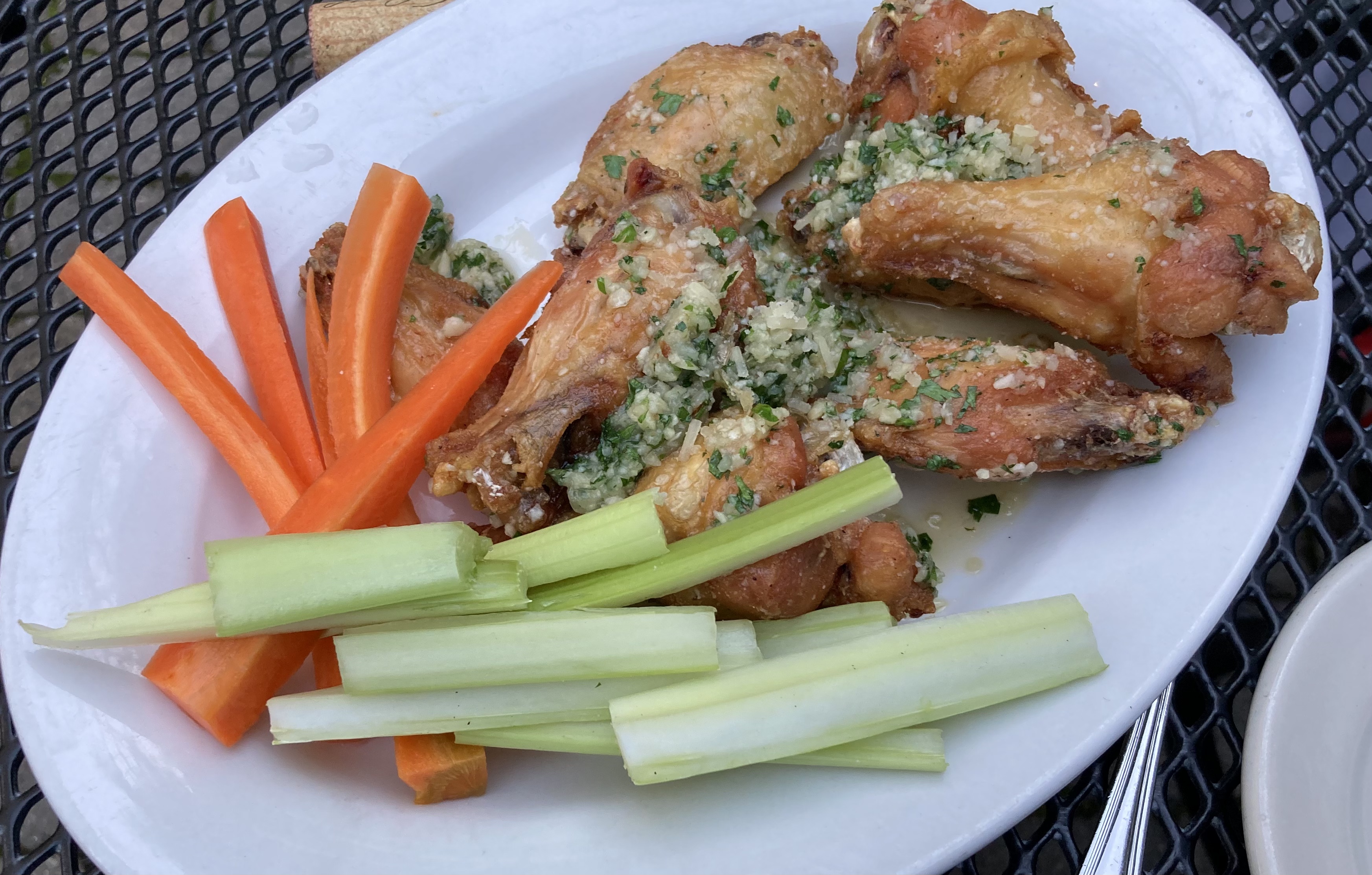 Whereas I had garlic-parmesan chicken wings followed by hanger steak, prepared rare (of course), exactly as ordered: