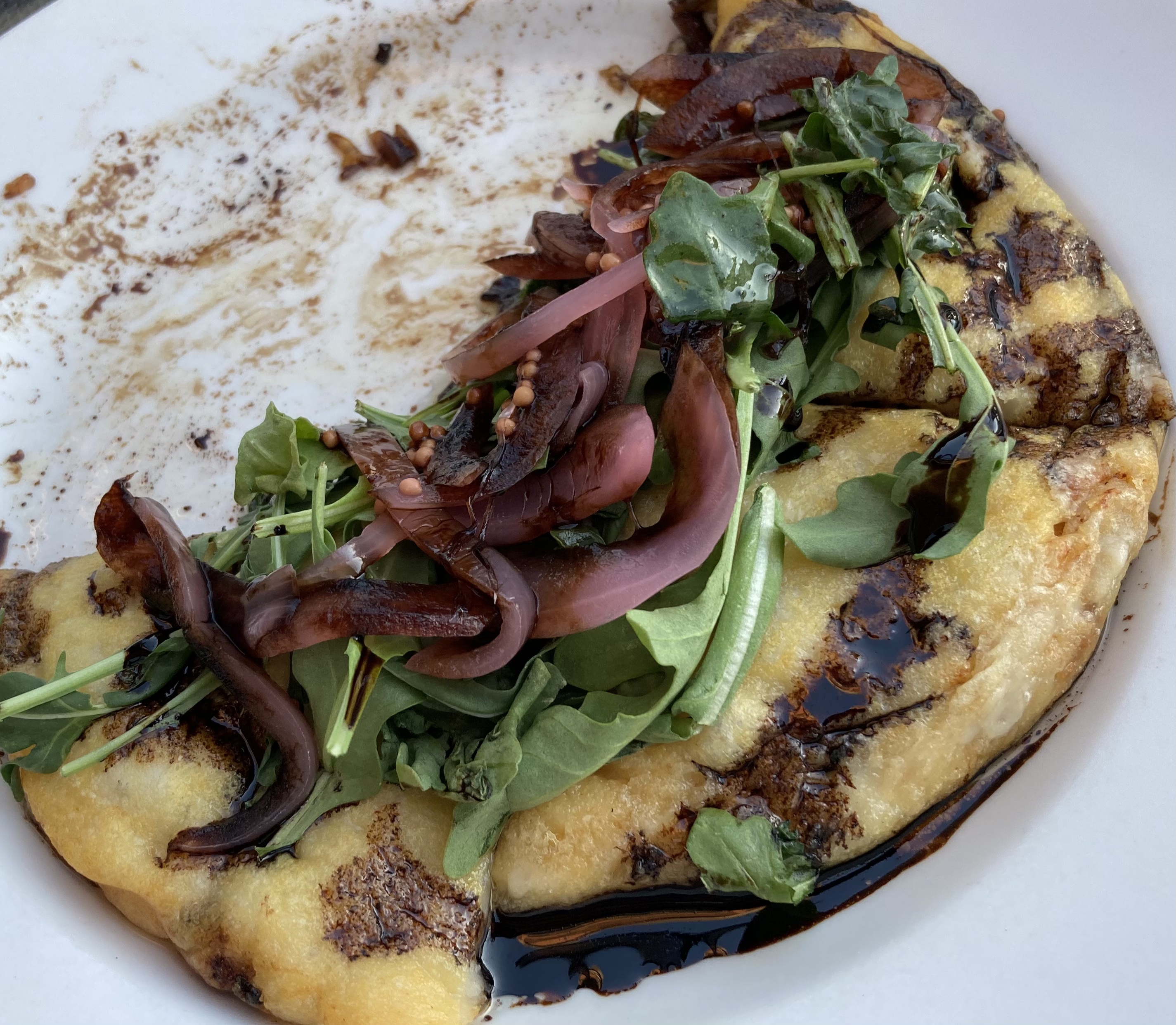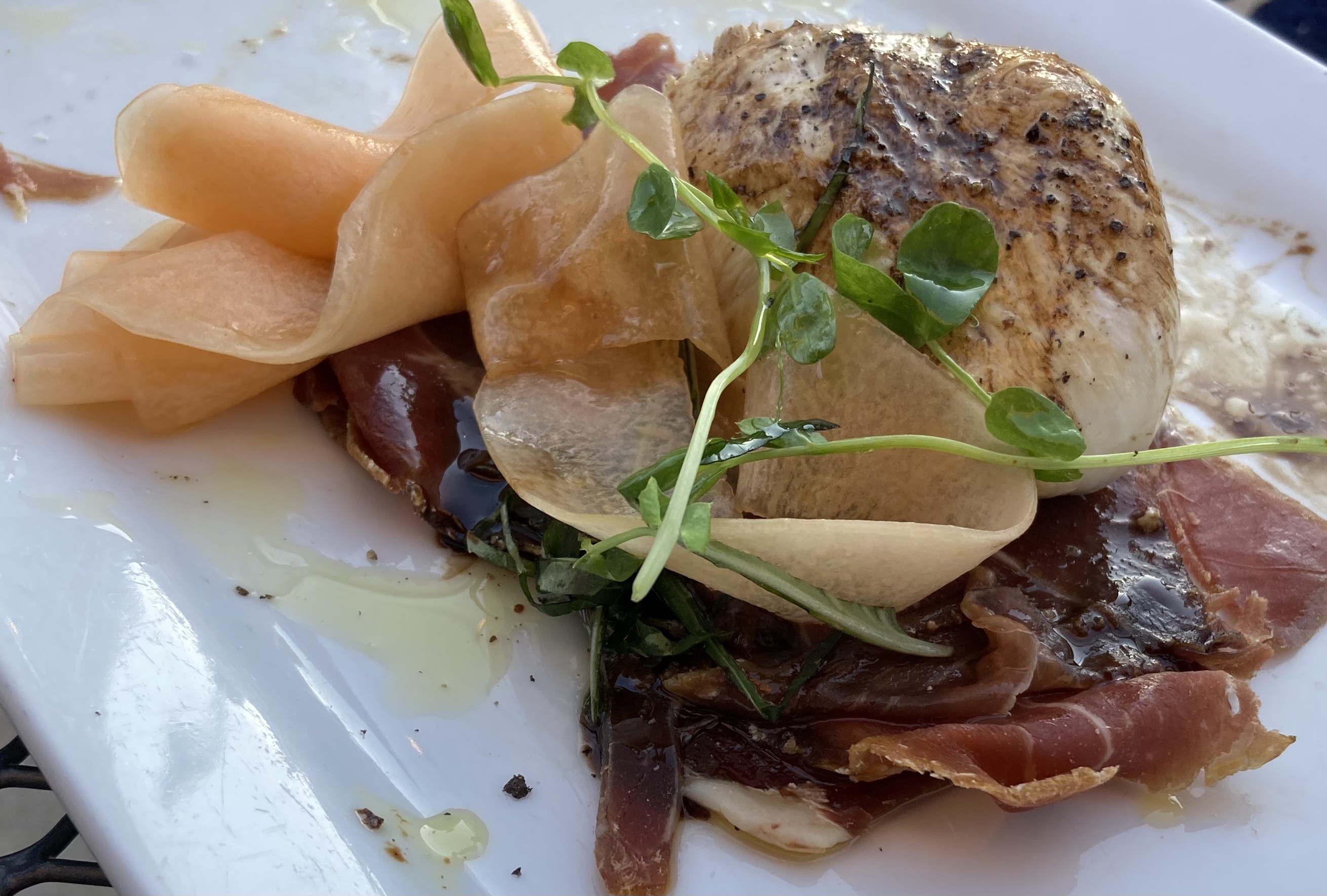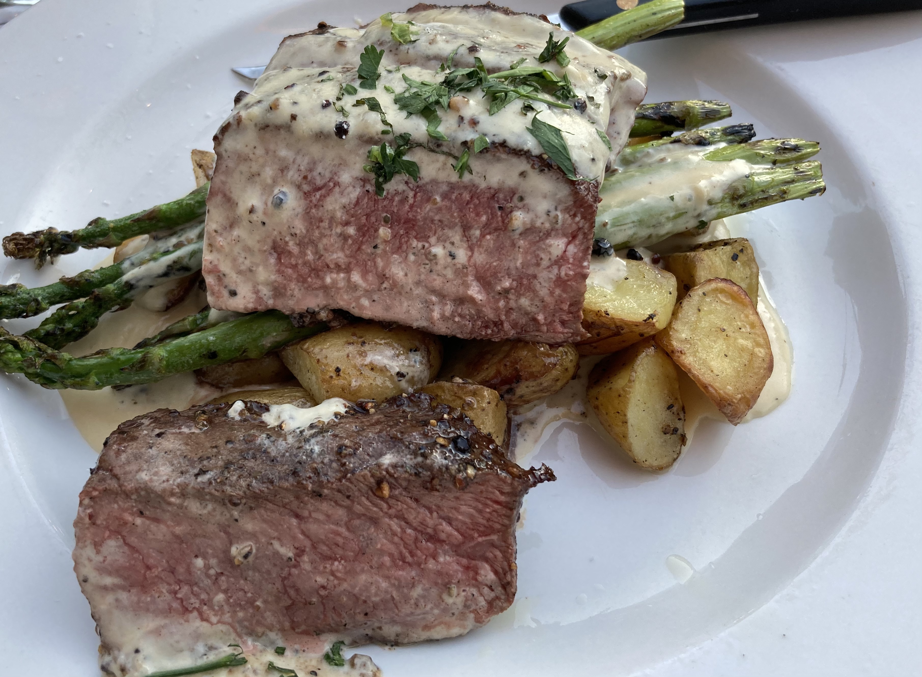 Scrumptious dinner last night out on the patio at Tavolo! Barbara started with chef’s burrata with arugula, melon, prosciutto, vincotto, and black pepper; my starter was frico (pan-fried grana Padang, potatoes, baby arugula, pickled red onions, with balsamic reduction). Unfortunately, as you’ll see in the photo below, someone seems to have eaten half of the frico before I could photograph it. Then, for mains, Barbara and I both had the wonderful bistecca au poivre, a peppercorn-crusted bavette with roasted potatoes, grilled asparagus, and cognac cream sauce. Takeout dessert was a lemon tart and a slice of flourless chocolate cake. Yum!
