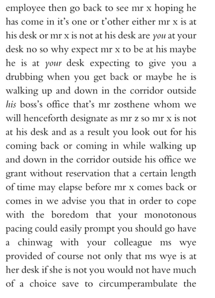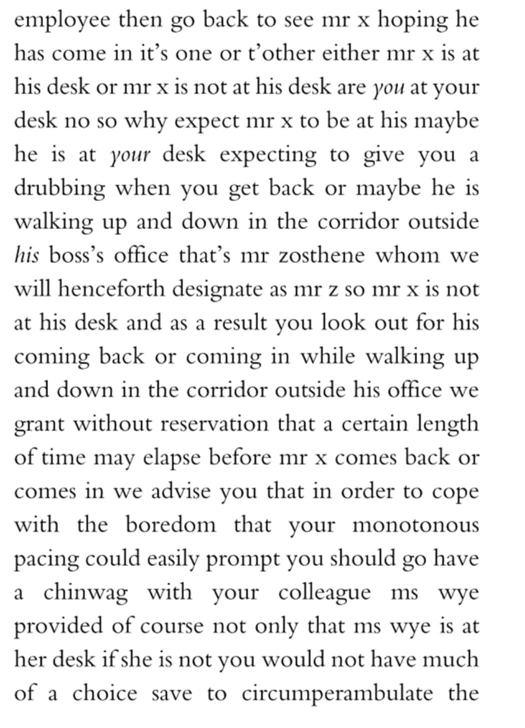 And then, of course, you look inside—and discover that for some reason the entire novel is one long 80-page sentence, with no punctuation and no capitalization.