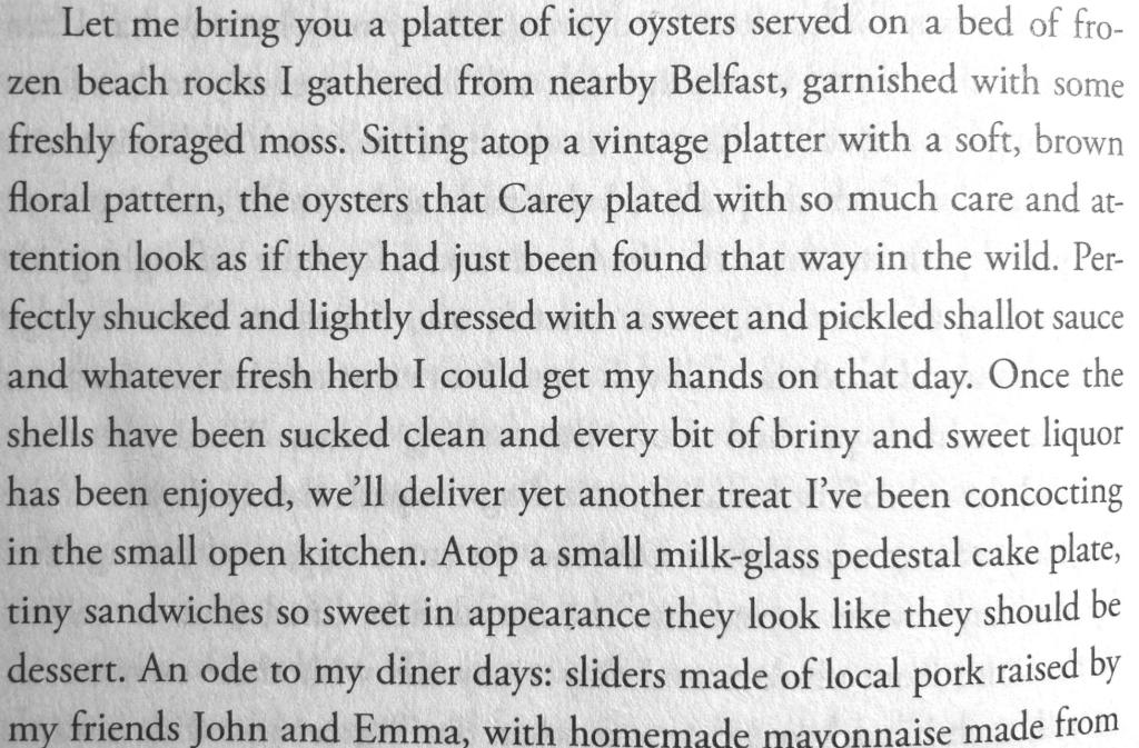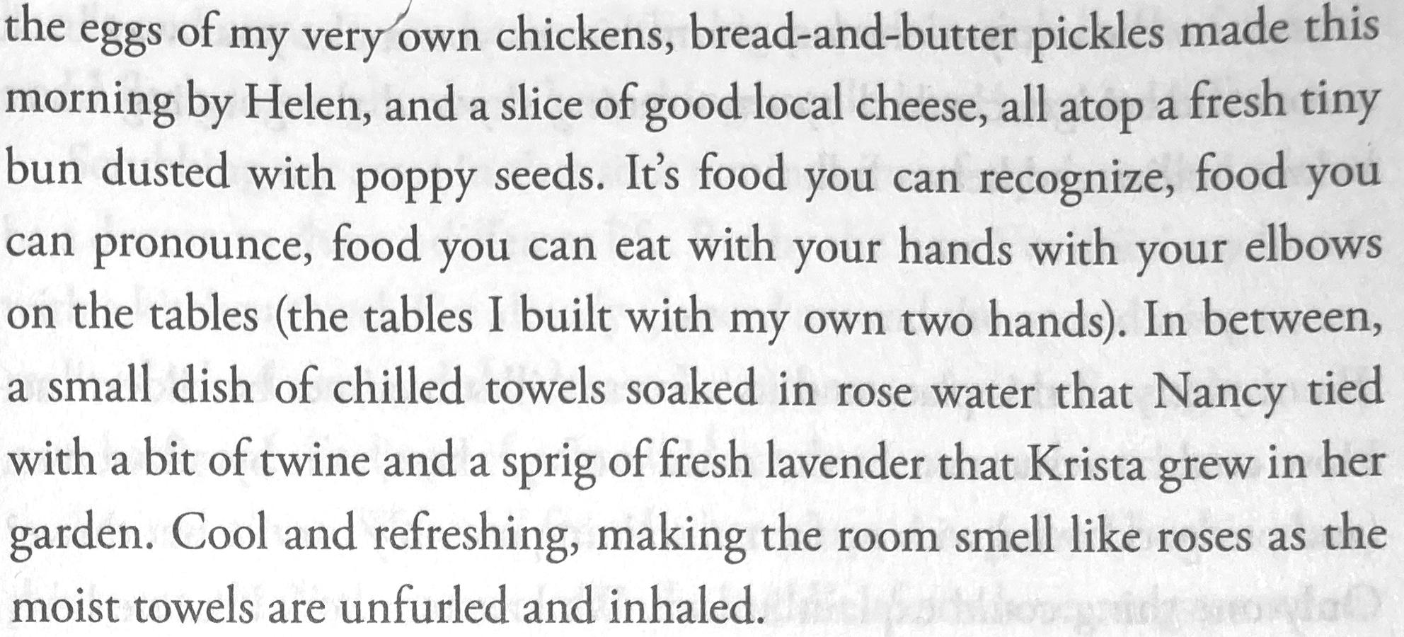 One of the things I loved about Finding Freedom was the prose, which approaches poetry whenever French discusses food. (See below.) Most chefs—at least most well-known ones—seem to have been trained at the Culinary Institute of America or other professional institutions. But French’s training was a combination of autodidacticism and the aforementioned diner. The culinary do-it-yourself attitude extended to related skills, such as building her own tables and rehabbing not only herself but the building housing the restaurant. (I do need to mention that there were two incarnations of The Lost Kitchen. The first, in coastal Belfast (Maine, not Northern Ireland), was lost in an ugly divorce when her husband seized it.)