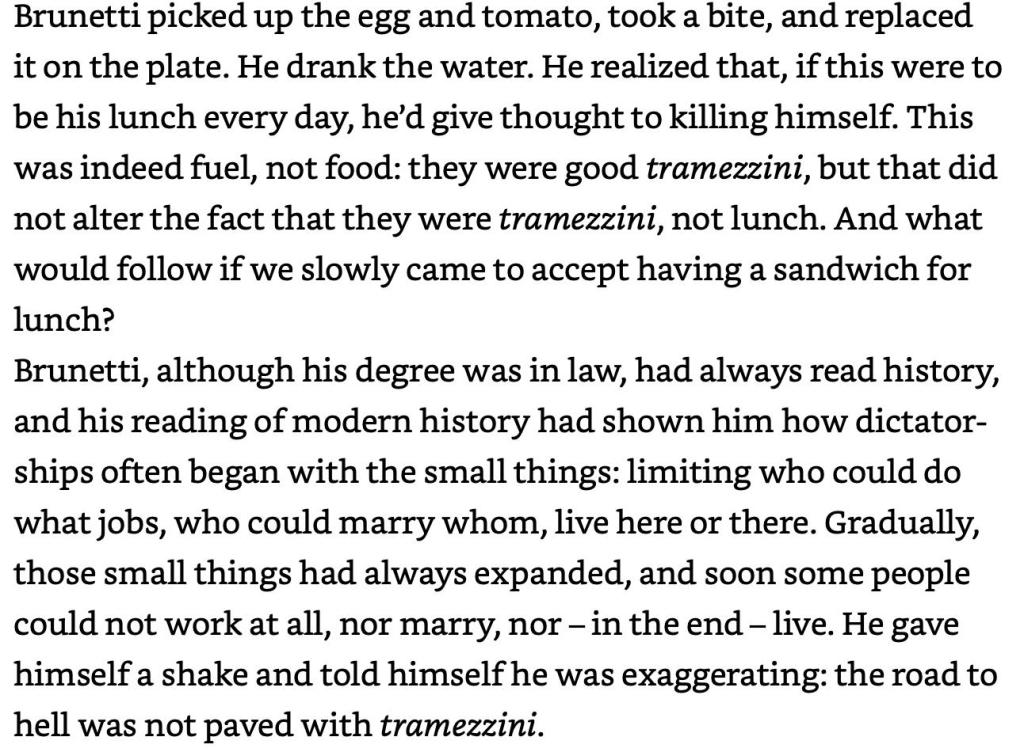 Every novel in the series contains a bit more about politics and a bit more linguistics than the novel before. The former is of the gender politics variety, not electoral politics. The linguistics includes a fair amount of two regional Italian languages—which some call dialects, and that’s political too—Veneziano and Napoletano, as indicated in the second excerpt below.