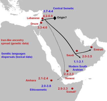 All of this just gives you a context for the map shown above, which gives a visual representation of the dispersal of Iran-like and Semitic languages in the region. Clearly linguistic and ethnic aspects are closely related (linguistics, in fact, used to be part of anthropology). But what does all this have to do with DNA and the human genome? There’s no way I can competently summarize the article in question, so I am just going to quote their abstract verbatim: