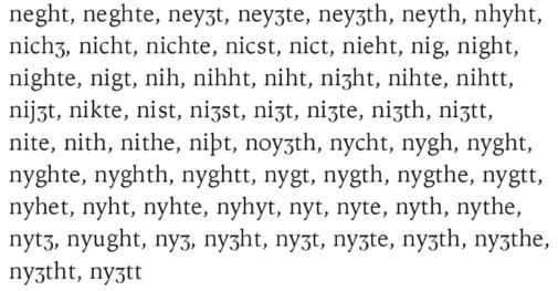 If you are of a prescriptivist frame of mind—in contrast to Crystal—you may object to his scientific, data-driven, evidence-based, descriptivist point of view. But you can learn! Because this book is a “story”—as the subtitle indicates—it contains a lot of history, so be prepared for a lot of old spellings. These are informative and provide plenty of context, so don’t skip them. Sometimes it does get to be a bit much, as in Crystal’s list of 60 acceptable spellings of night during the 13th century, according to the OED: