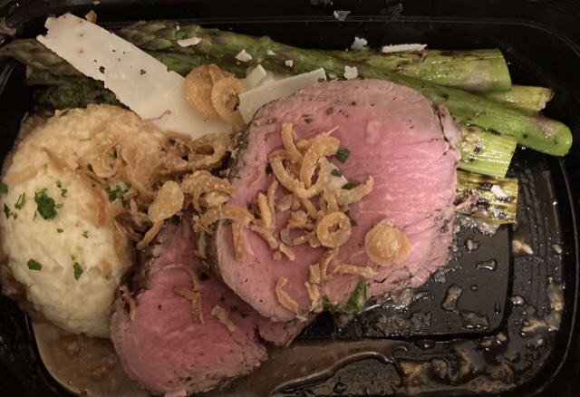 Then came the entrée: grilled peppercorn-encrusted tenderloin accompanied by grilled asparagus and a purée of celery root and potato. See the photo.
