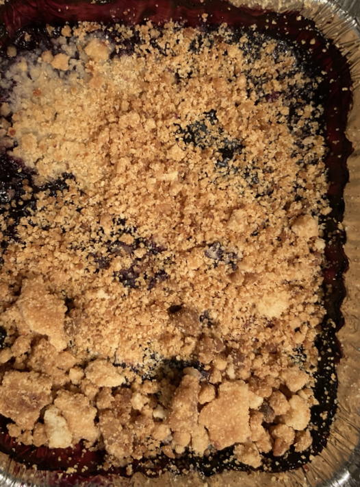 Finally, the dessert: a warm blueberry crisp tart (warm after reheating, of course).