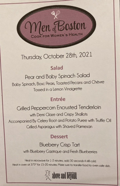 This year it was held yesterday. It was virtual, of course. In past years the Health Center erected a huge tent filled with stations offering delicious food from restaurants all over Boston, ostensibly prepared by men who were either celebrities or at least well-known in their fields. (I say “ostensibly” because often they were merely reheating and serving, but that’s okay too.) This year it was not just the speeches and music that had to be virtual, the food had to be as well. So how do you do that? You offer delivery from Above and Beyond Catering, that’s how.