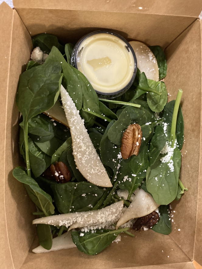 As you see from the menu here, we started with a creative pear and baby spinach salad; I enjoyed the omission of pecans, as requested, and Barbara enjoyed the lack of omission, as requested.