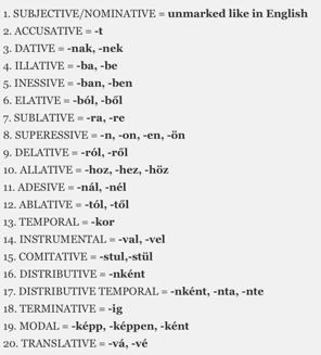 If you’re interested in the various mechanisms for expressing grammar, check out some varied languages to get yourself out of the Indo-European rut. Spanish and German only show you a tiny slice of what exists. At one extreme you have languages like Mandarin, in which there is virtually no inflection, but at the opposite extreme you have languages like Hungarian, with 18 cases, though some claim 20! Since you asked, I looked these up, and here is one list: nominative, accusative, dative, illative, inessive, elative, allative, adesive, ablative, sublative, superessive, delative, instrumental, commutative, causal, terminative, temporal, translative, and modal. Now there’s grammar for you! (Remember Mark Twain’s wonderful essay, “The Awful German Language”? No? Well, we’ll write about it in a subsequent post, and you’ll find out how “many a new student who could ill afford loss has bought and paid for two dogs and only got one of them, because he ignorantly bought that dog in the Dative singular when he really supposed he was talking plural.” And German only has 4 cases, not 18 or 20!)