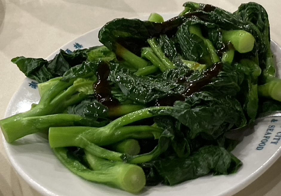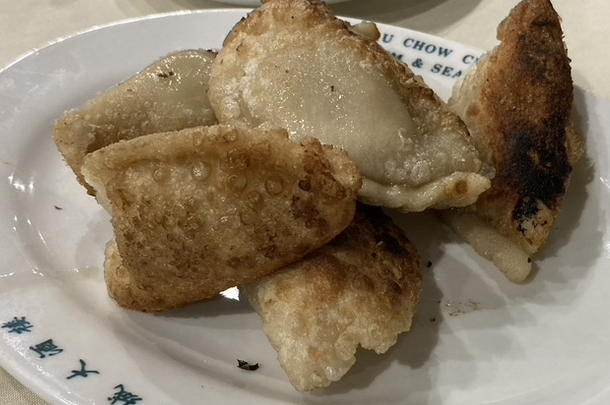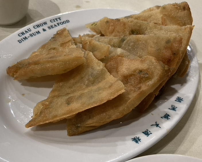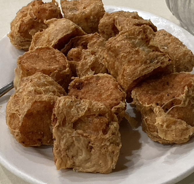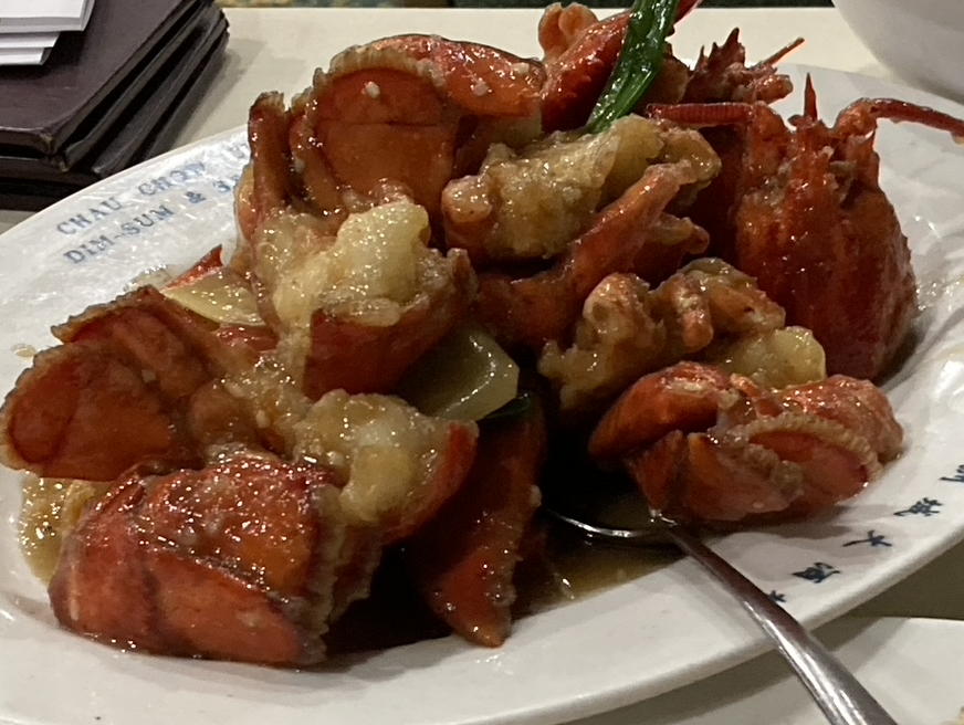 Three appetizers should have been enough. But no, we also had to have three main dishes: Chinese broccoli with oyster sauce, twin lobsters with ginger and scallions (we resisted asking the server “How do you know they’re twins?”), and an astonishingly good dish, Chau Chow City lightly fried shrimp nuggets with soybean skin (new to us):