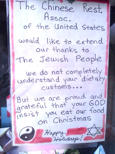 - First of all, there are at least two compelling explanations for the Chinese food at Christmas. The more straightforward one is simply that Chinese restaurants are among the few that are open on Christmas Day (also hotel restaurants, if you live near a hotel, but they would spoil the story). The more interesting explanation is that there is a solidarity between Jewish and Chinese people because both were outsiders when they came to America. As one of my ABC students said to me, “My parents are upset that I’m dating a non-Chinese boy, but they say ‘at least he’s Jewish, which is second best.’”