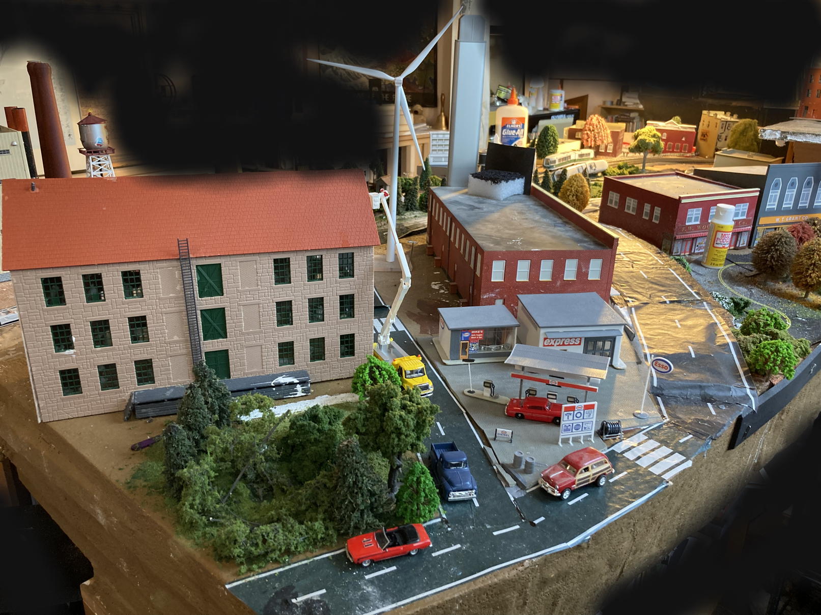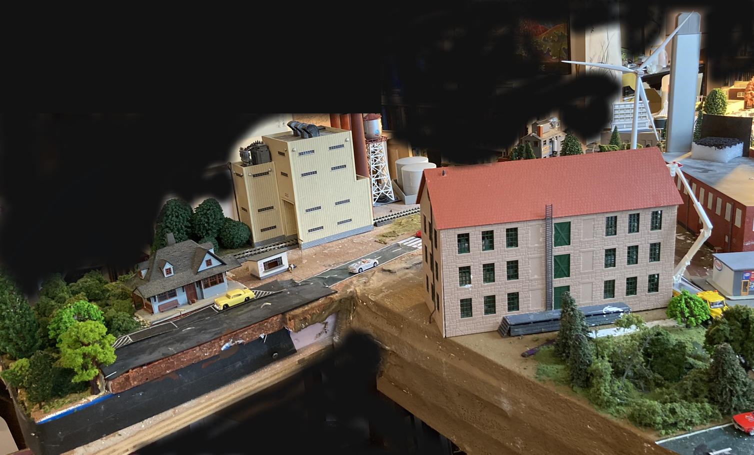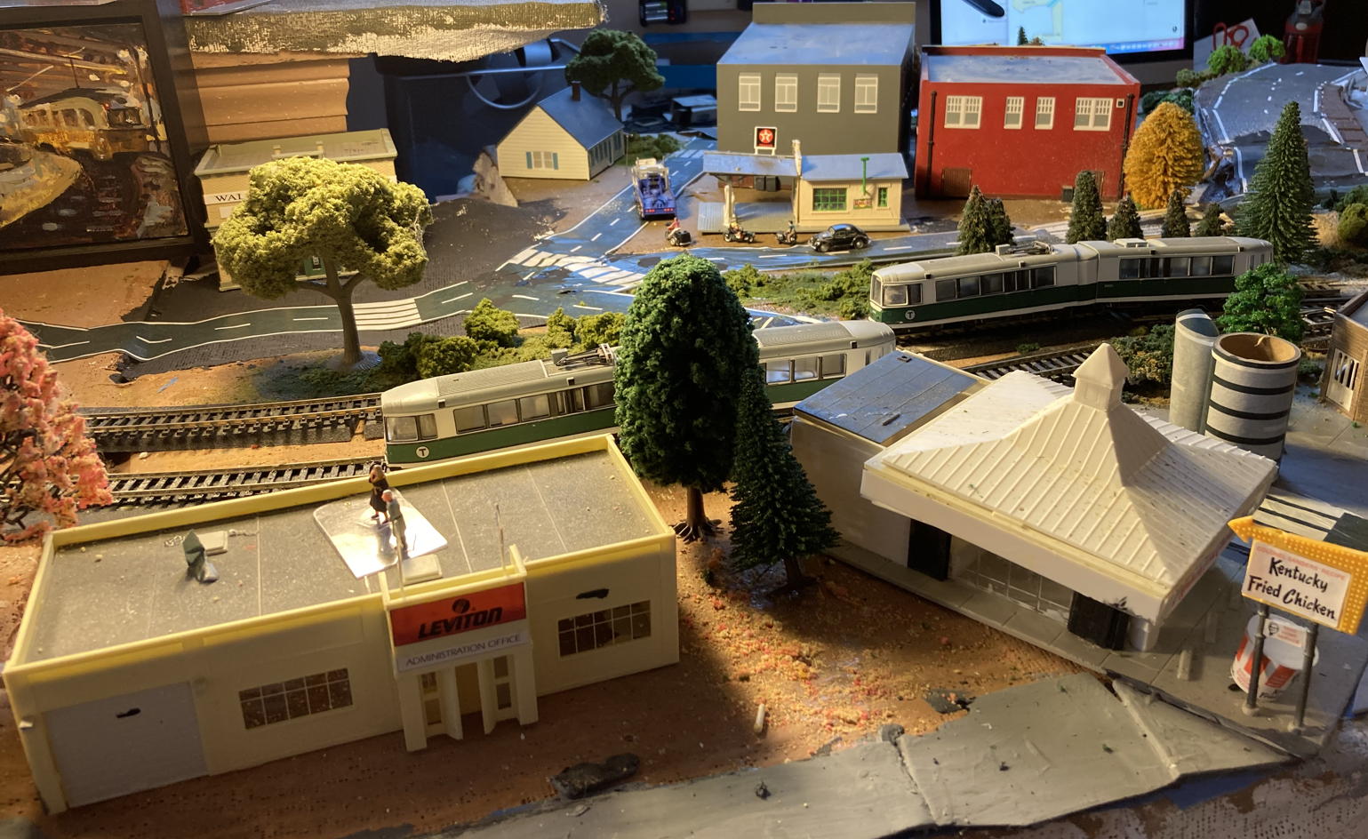 Now three photos of the current state of PowerTown, plus a fourth showing a little bit of the commercial stretch of The ’Burbs, still insufficiently scenicked [I hate that word!] and otherwise incomplete: