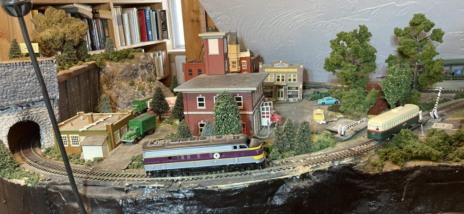 Before I go on, I should point out that this is a scale model, not a toy train set! Everything is precisely 1:87 (HO) scale, thus appealing to any geometry teacher’s heart. Actually, the word “precisely” isn’t precisely accurate. Every model railroad requires what is called selective compression: distances have to be shortened, streets can’t be as wide as they would be IRL, trees can’t be as tall as scale would dictate, neighborhoods have to be compressed to a small fraction of their scale size. And of course there is another problem with scale models: