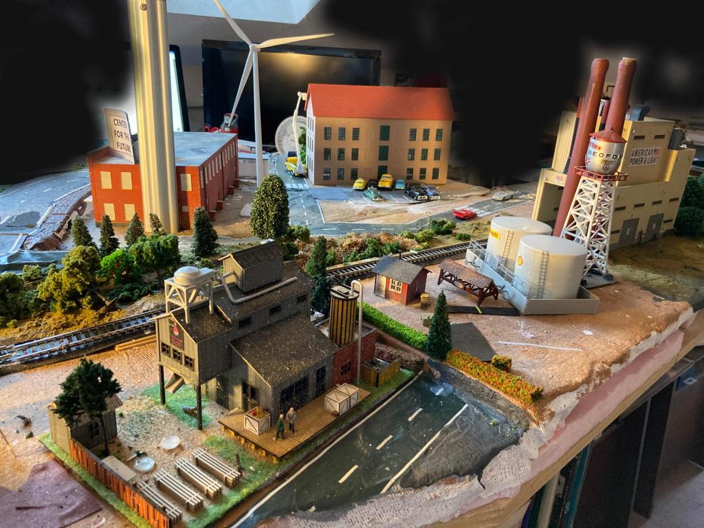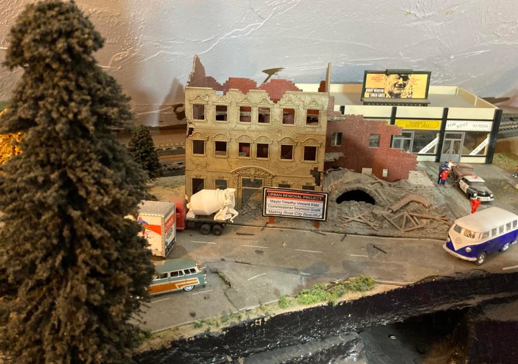 What’s left to do? Too much to list here, but some neighborhoods need more structures (most of which I will build from kits or by kitbashing), they all need more landscaping, trackage needs to be finished, so do the roads, signs and signals have to be installed, a lot more of the little people need to be placed appropriately, buildings and trains need weathering, water features have to be located here and there and filled with fake water, and it all of course needs to be wired for lighting and electricity. Gulp.
