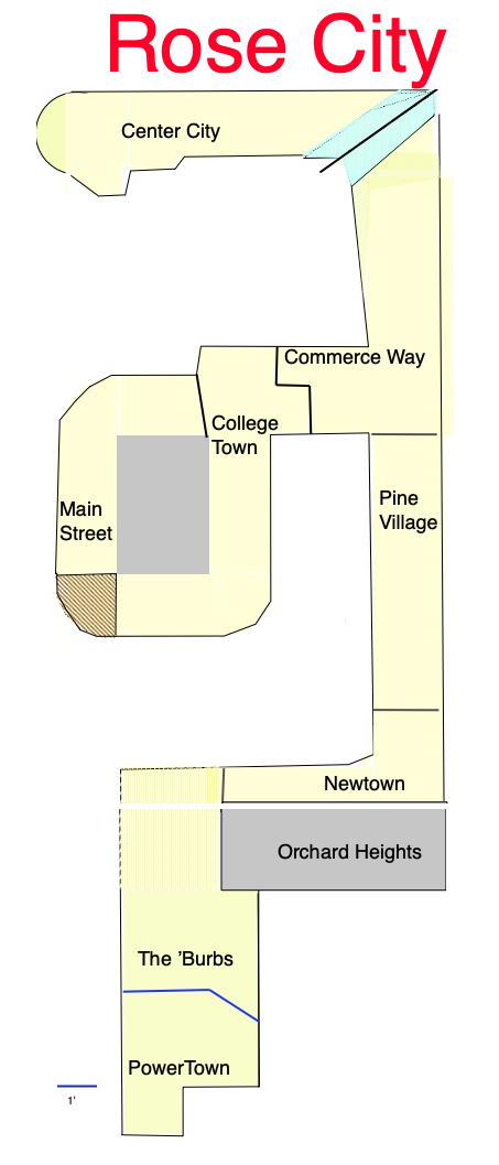 Center City is only one of the nine official neighborhoods of Rose City. Here’s the full list, with a very brief comment about each. Neighborhoods 2, 3, 6, 8, and 9 are too incomplete at this point for me to show: