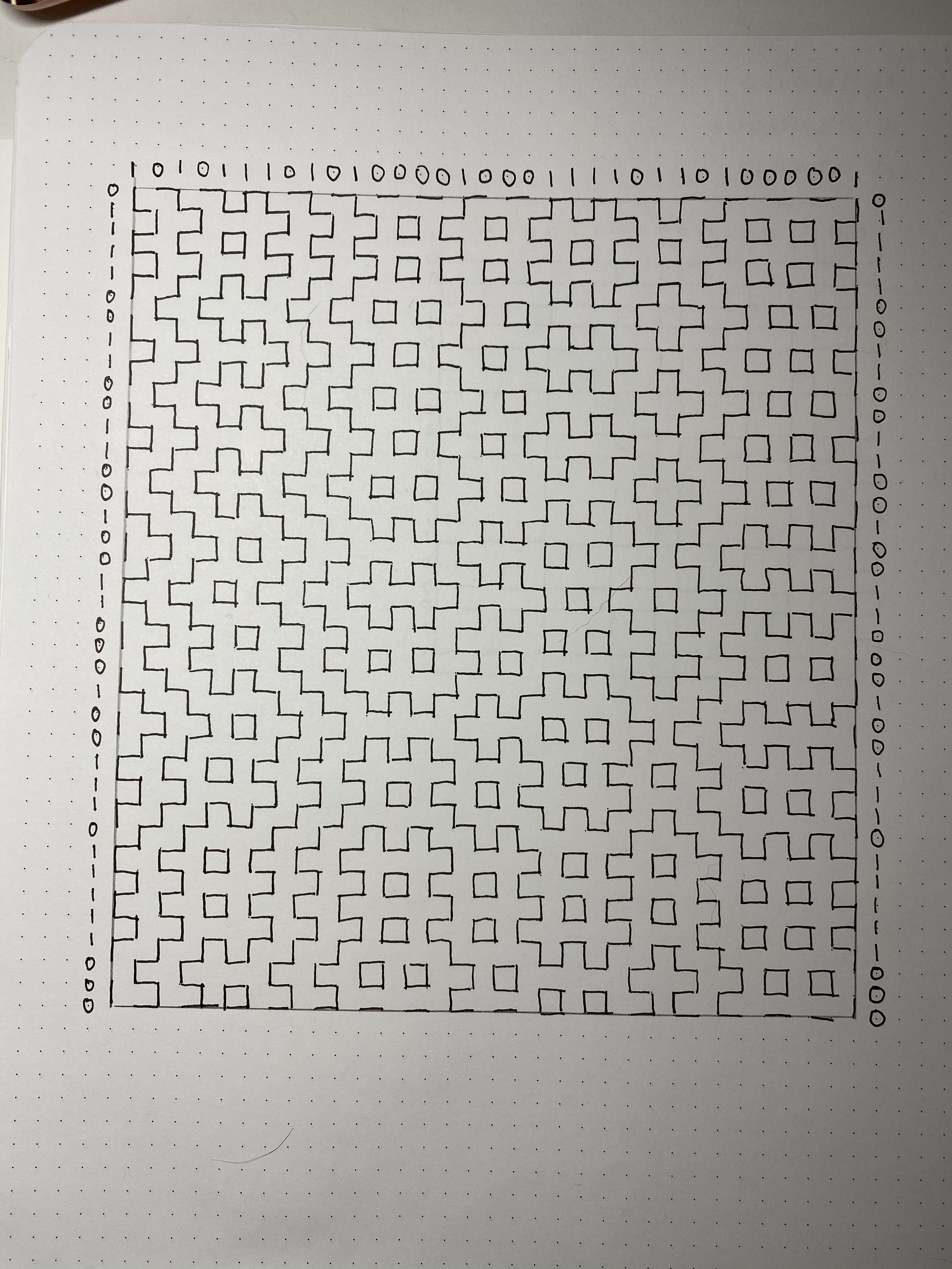 So this is an annotated Hitomezashi pattern. Let’s look at the evidence before we define and generalize it. You’ll notice a few salient observations: