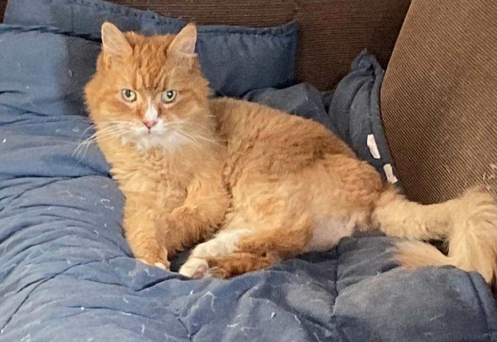 On his blue comforter, even if for some reason it has a lot of cat fur on it: