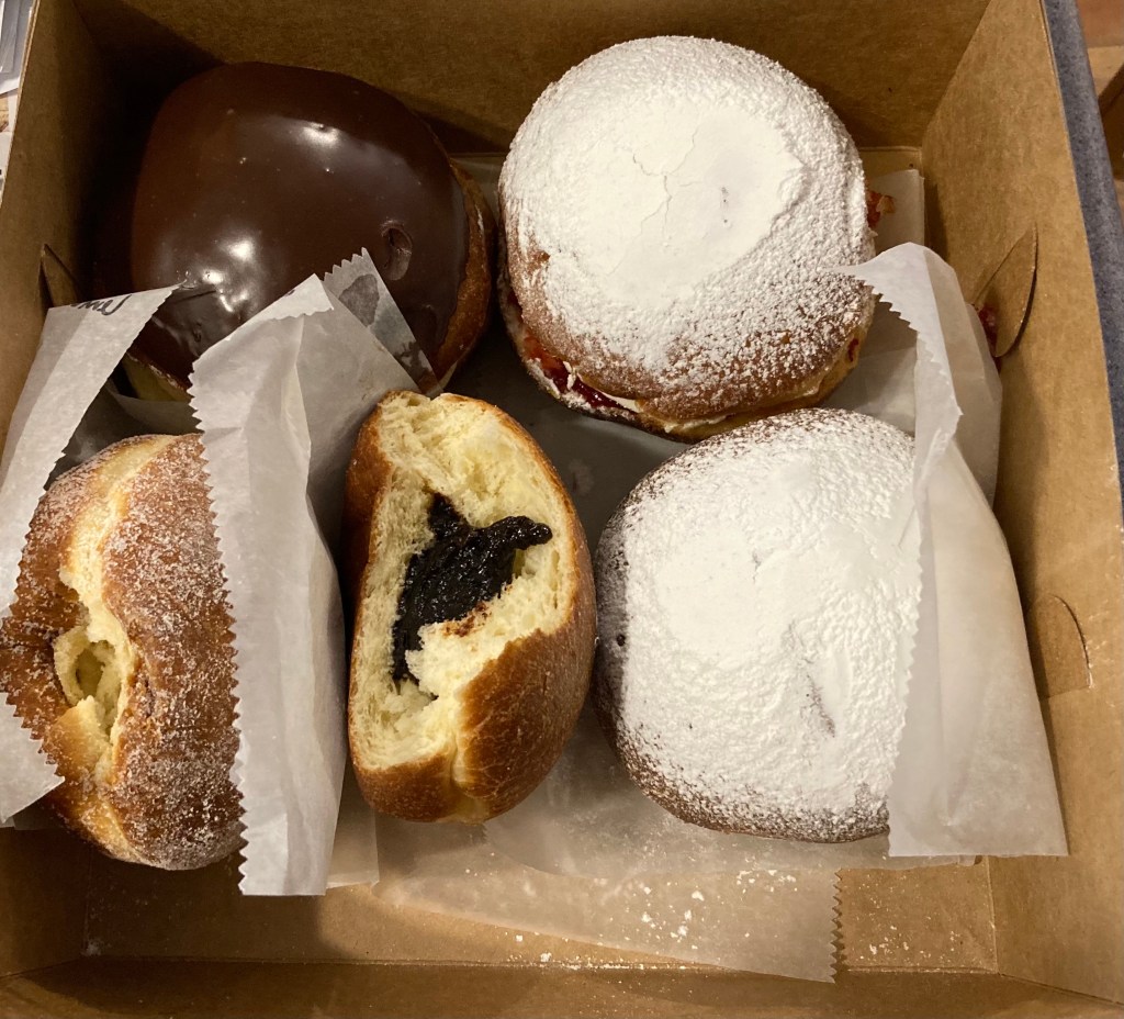 First, some context: The northern tip of Dorchester that I mentioned in the previous paragraph is commonly called the Polish Triangle, for reasons that you can guess. One of several Polish stores there, DJ’s Market, sells store-made pączki, probably year-round but certainly at least this month in honor of Fat Thursday, so we bought five of them as you can see in my photo. (Sorry: somebody got to the box ahead of me and destroyed half of one of them. We’ll blame the cats.) Now you can tell from the photo in DJ’s website that they must be good citizens, since the sign in their window reads “bądź bezpieczny: wear a mask” (the first two words apparently mean “be safe”; thank you, Mr. Google). So their pączki must be good. As I suggested above, they are something like sufganiyot or jelly doughnuts or berliner, but all four pastry types are actually slightly different. You could do your own research, as they say these days. Barbara and I bought one each of five flavors: raspberry with powdered sugar, raspberry buttercream, prune butter, coffee mocha with chocolate glaze, and lemon with granulated sugar. Yum!