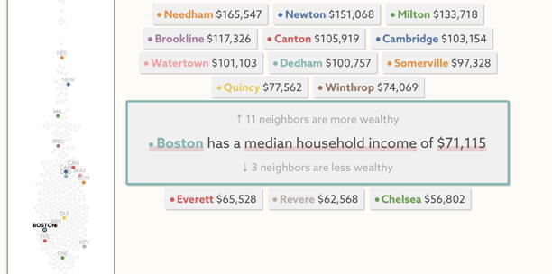 If you know the towns pictured above, you can tell why they make an odd conglomeration to be put in a single district. But it’s always helpful to have some hard data, so you can tell why Andover and Lawrence are “neighbors in name only” when they are combined into a single district; one of the websites that the presenters showed us allowed us to compare median household income in any town with that of each of its neighbors. Take Boston, for example: