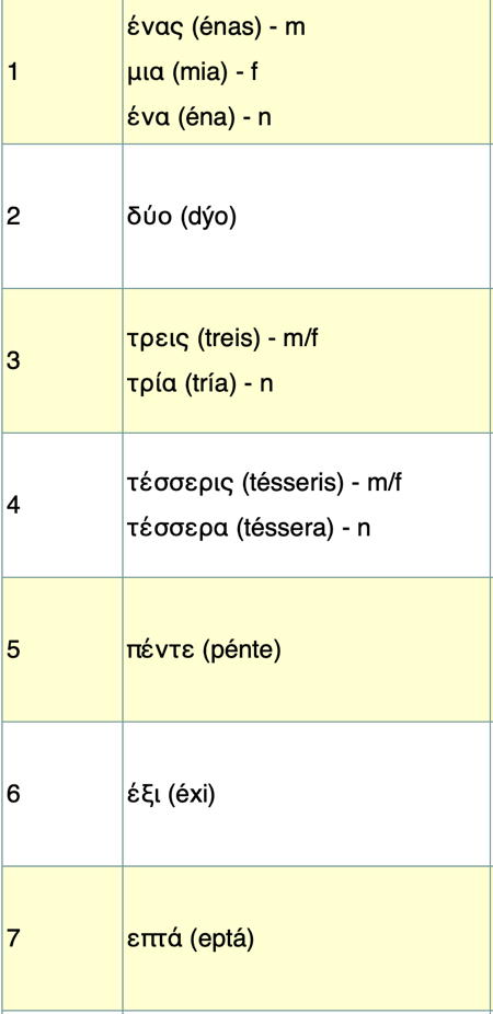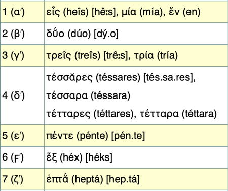 Before we go, though, as a math teacher I have to highlight a particular page, the one on Numbers in Various Languages. For instance, suppose you want to compare and contrast the names of the numbers in Ancient and Modern Greek, as I had to do in the pre-Internet days of 1966. If I had had access to Omniglot I would have easily found all the data I needed. Here are two clips, showing just 1–7 in Ancient and Modern Greek respectively: