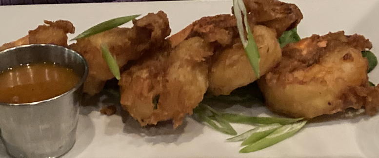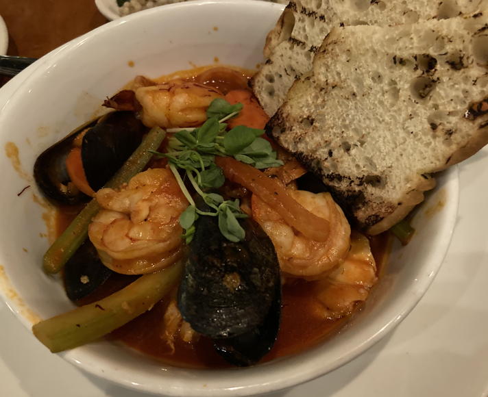 Speaking of entrees, those side dishes accompanied two new offerings. One that you don’t see often around here was a bouillabaisse containing cod, shrimp, and mussels in a saffron tomato broth with fennel, accompanied by grilled bread. It was a little bland but still delicious. Finally came jumbo fried shrimp with spicy mango dip. Genuinely jumbo, genuinely delicious, and the dip was not too spicy for Barbara. Although this dish is listed as a starter, it is generous enough to serve as an entree.