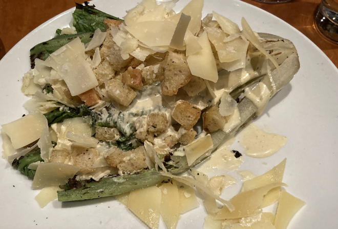Well, one was actually a return appearance from two or three years ago. That was the grilled Caesar Salad: an otherwise traditional Caesar Salad that was built on a grilled head of romaine. Also, the generous topping of parmesan was shaved rather than shredded or ground. Yummy!