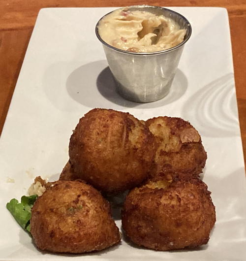 Among the truly new items, a standout was the enticing serving of five cheddar-and-scallion croquettes with smoked bacon aioli. Unusual and delicious! We will be back for more next month. (April is coming soon, isn’t it?)