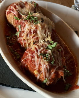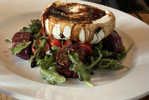 Barbara started with the Chef’s Burrata; this time it came with roasted red beets, cherry tomatoes, arugula, red onion, dijon balsamic vinaigrette, and aged balsamic. She reports that it was yummy, and had to take half of it home. I started with the even yummier (IMHO) so-called appetizer-sized house-made meatballs, which came with house-made marinara and parmesan. I had to take half of it home.
