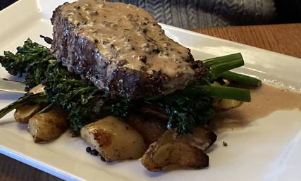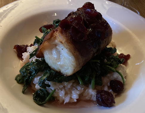 Then, of course came the entrees. Barbara had black-pepper-crusted flatiron steak, with roasted potatoes, broccoli rabe, and a black pepper cream sauce. She took half of it home. I had the amazing speck-wrapped cod, which came with shallot risotto, wilted spinach, and cranberry compote. (For those who are not in the know, speck is the same as prosciutto, except different.) I had to take half of it home.