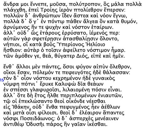 That, of course, is the first page of The Odyssey, more than 1000 years older than the Biblical text above! So why is it so much more readable? (Again, pretend that you can read ancient Greek.) As stated in the second paragraph above: without knowing Greek, list at least three different ways in which it is more readable than the first passage for the reader who does know Greek.