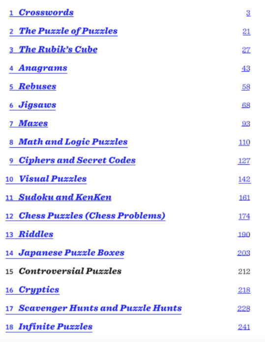 The Puzzler is a multifaceted work. In addition to all that personal stuff—which permeates all the chapters—you get histories and descriptions of various puzzles; you get a whole bunch of actual puzzles to try for yourself, including a contest!; and you get a well-organized compendium of 18 types of puzzles. You can glean what most of them are by scanning the table of contents: