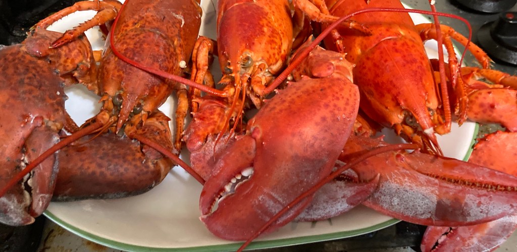 Freshly steamed take-out from George at Adams Fish Market. The cats are very curious.