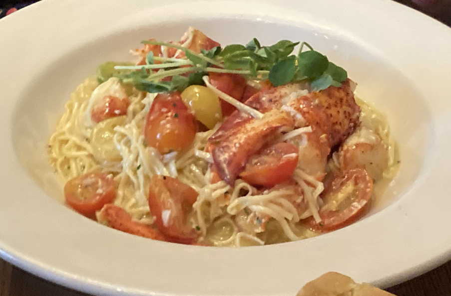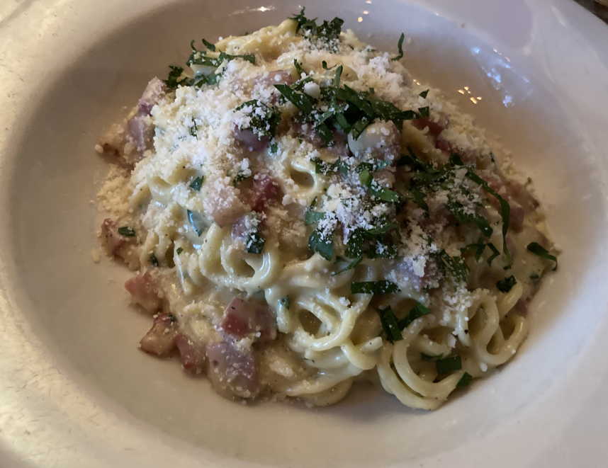 We started with rosemary focaccia with chili flakes, parmesan, and evoo. Barbara also had roasted parmesan cauliflower, which she liked for some inexplicable reason, but fortunately she kept it two feet away from me. Then Barbara had lobster scampi with tomato, garlic butter, and house-made linguine. I was happy to help with that. I had the carbonara with house-made chitarra, pancetta, romano, egg, and parsley, which I hadn’t had there in a while. For dessert (taken home) we had the lemon tart with mascarpone whipped cream, and the flourless chocolate cake with mascarpone whipped cream. Everything was delicious!