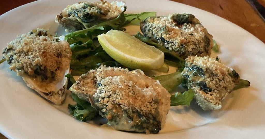 So we went to our usual favorite, the Ashmont Grill. Barbara started with what used to be called Oysters Rockefeller, now renamed Oysters Bezos. Or is it Oysters Musk?